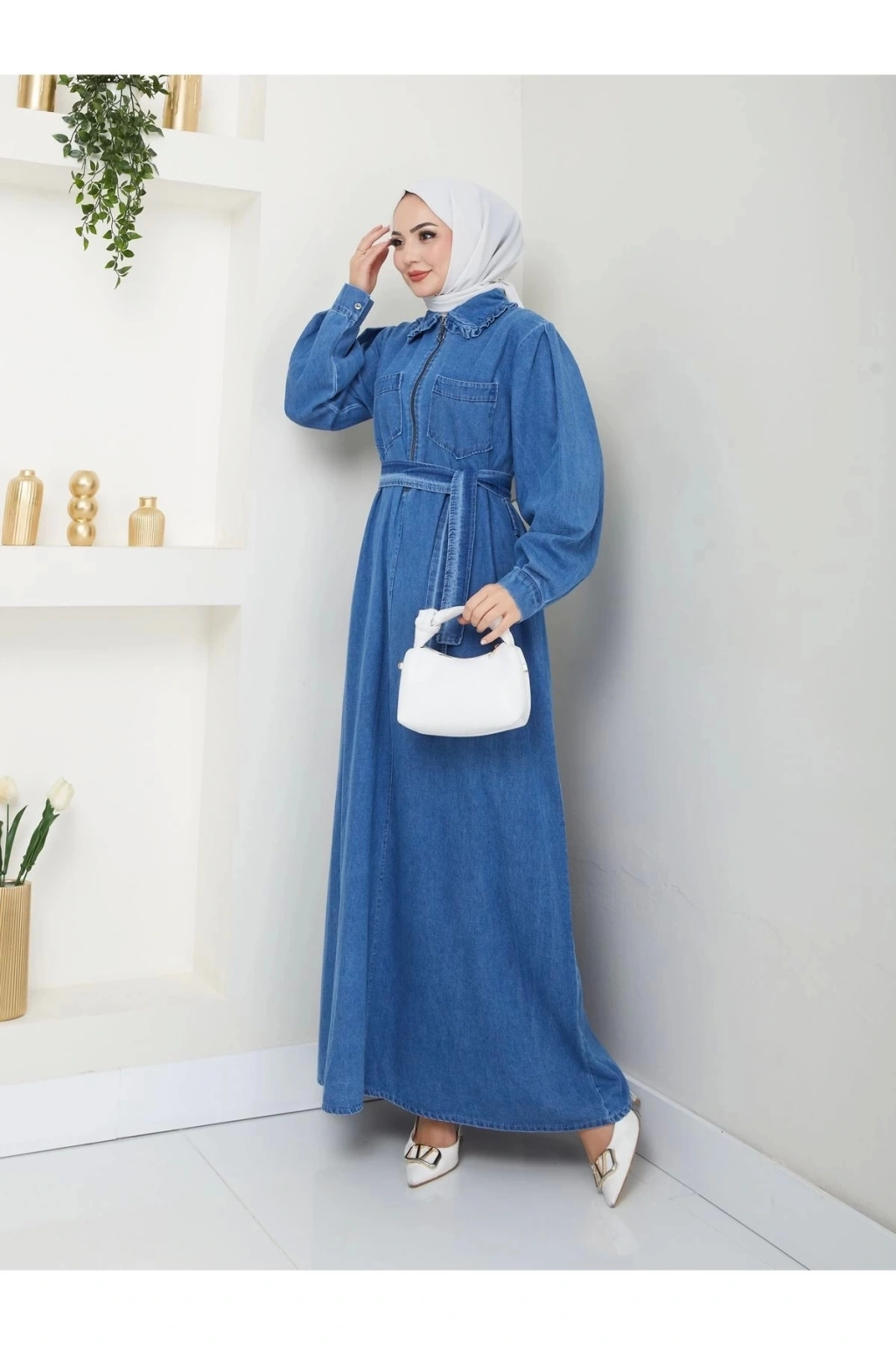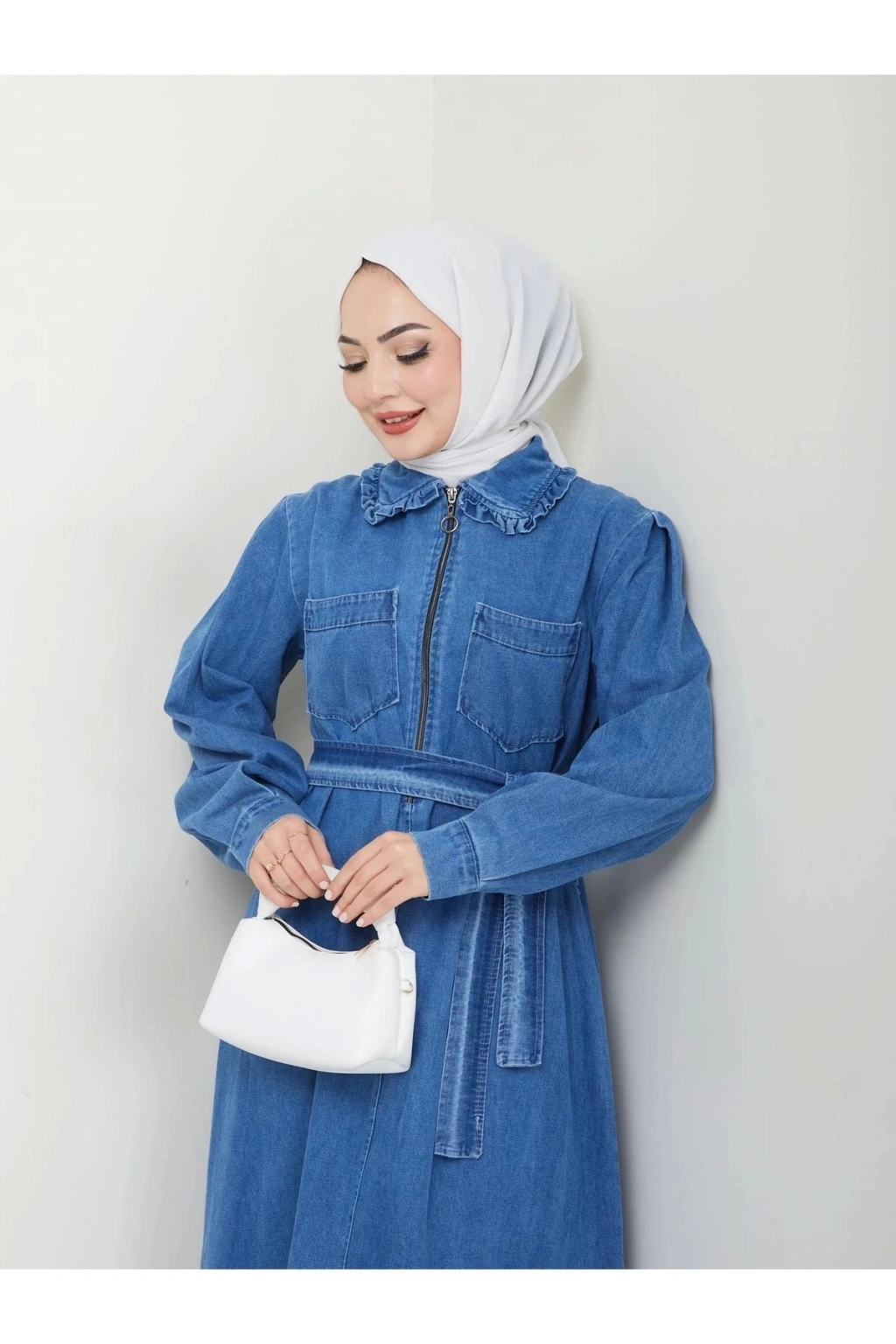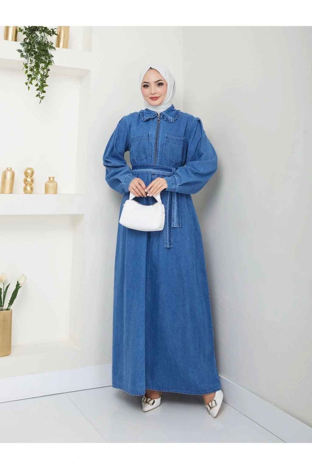 CEOLİ FERMUARLI TESETTÜR MAVİ KOT ELBİSE