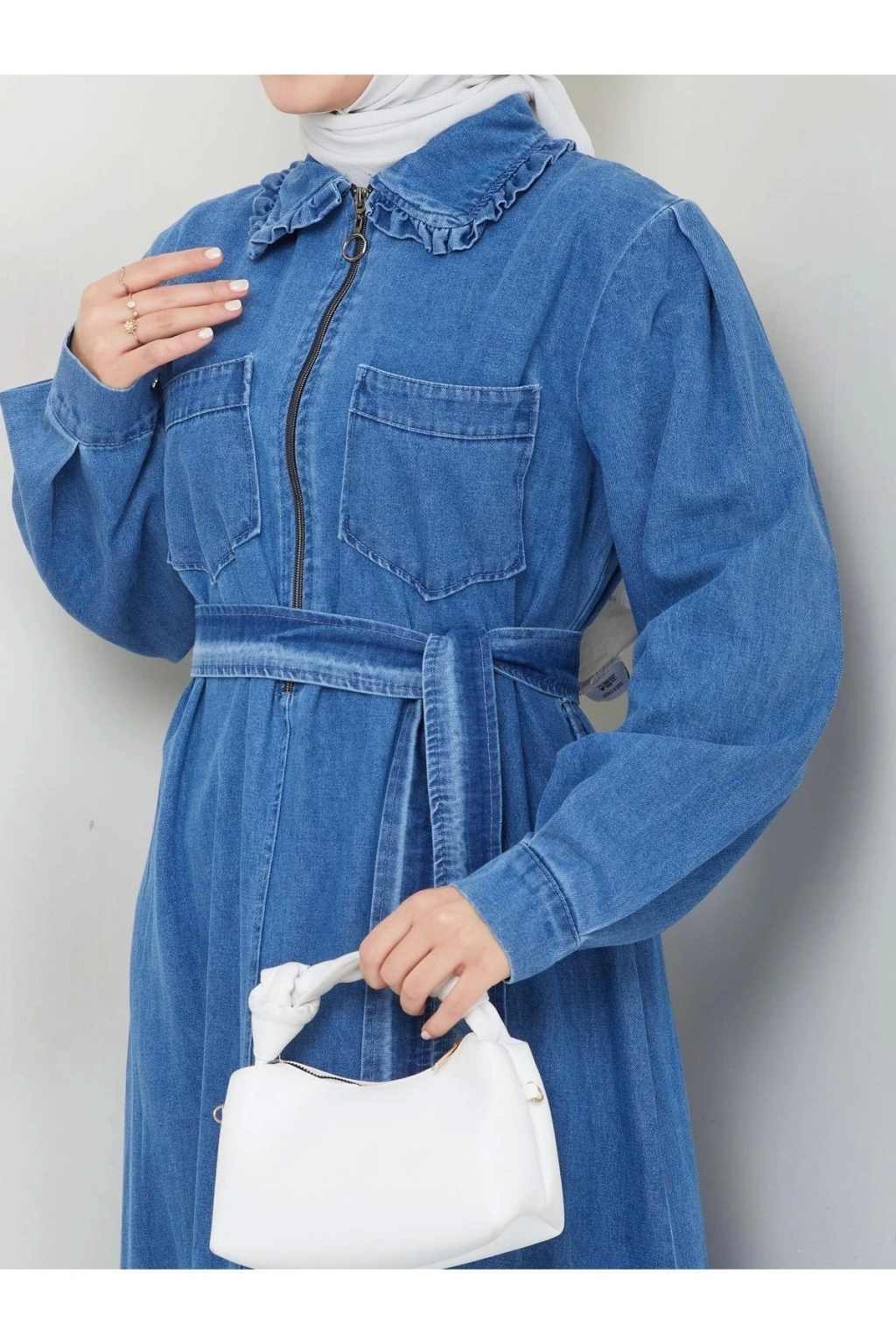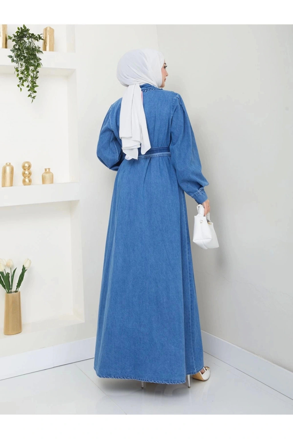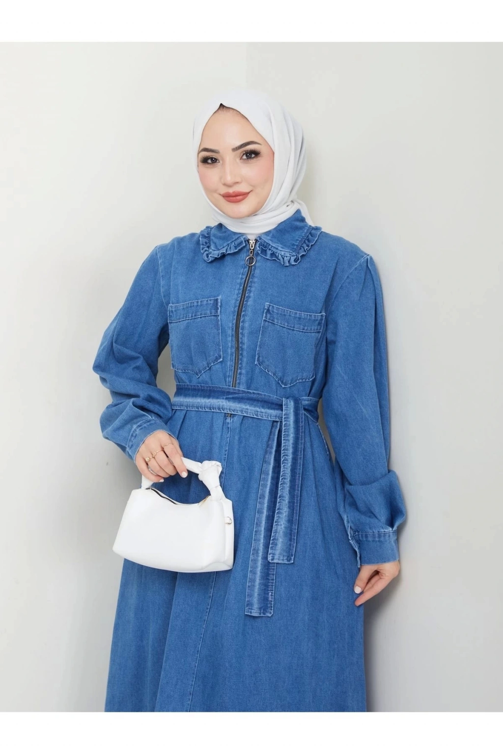 CEOLİ FERMUARLI TESETTÜR MAVİ KOT ELBİSE