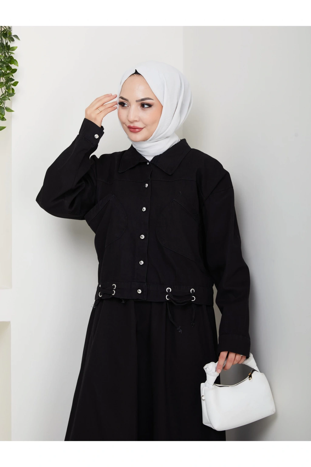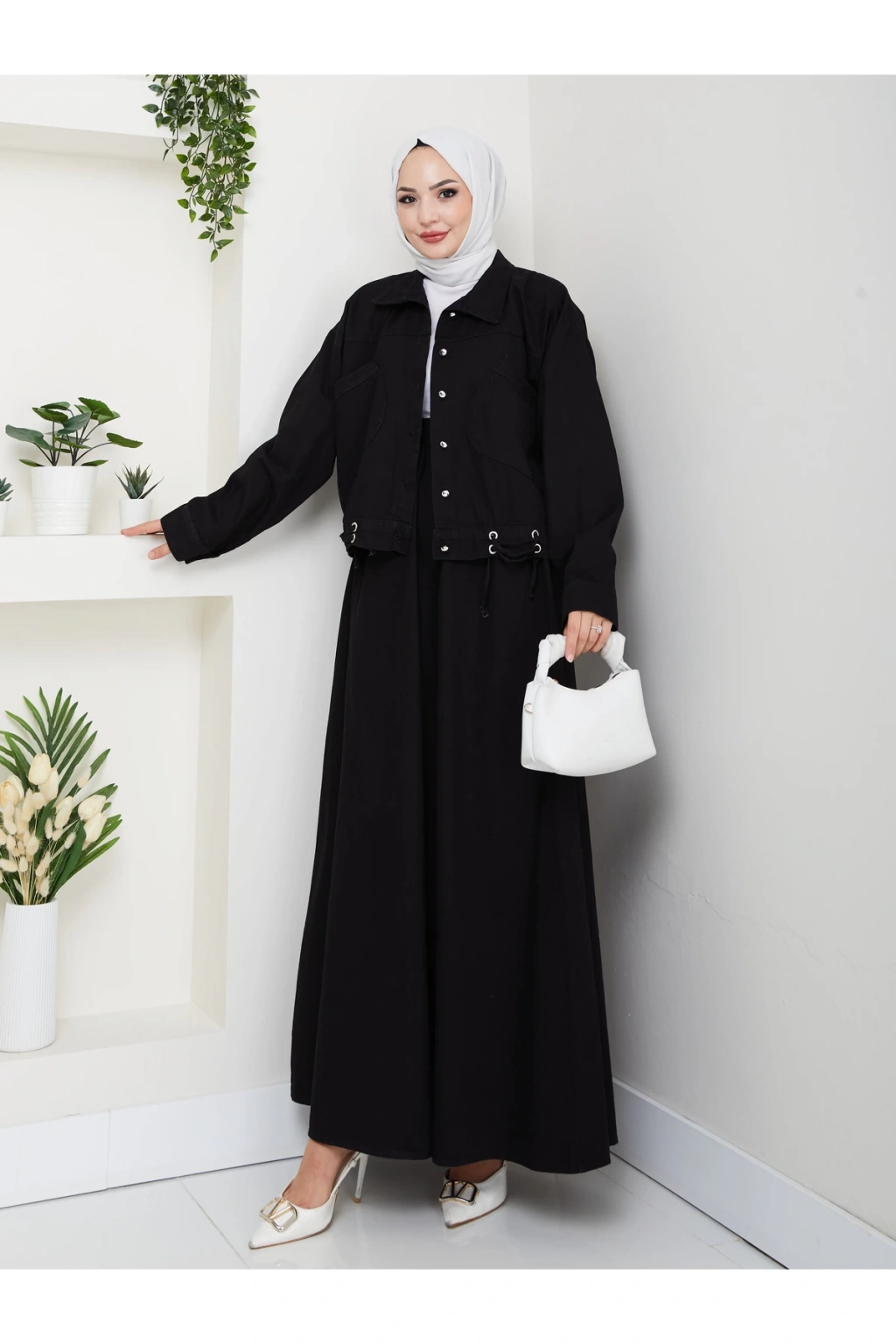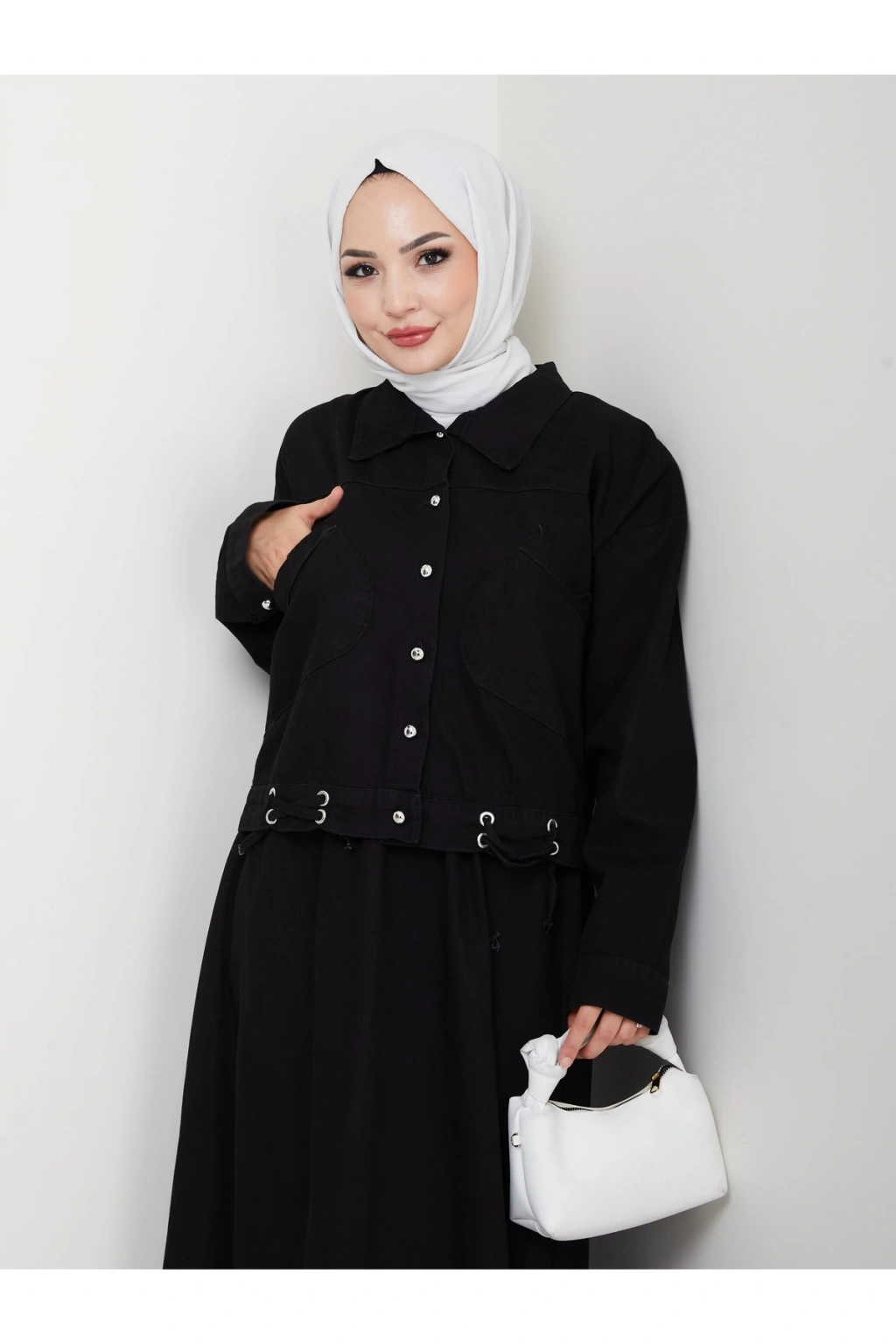 CEPLİ DETAYLİ SİYAH KOT TESETTÜR ETEKLİ TAKIM KOT KUMAŞ