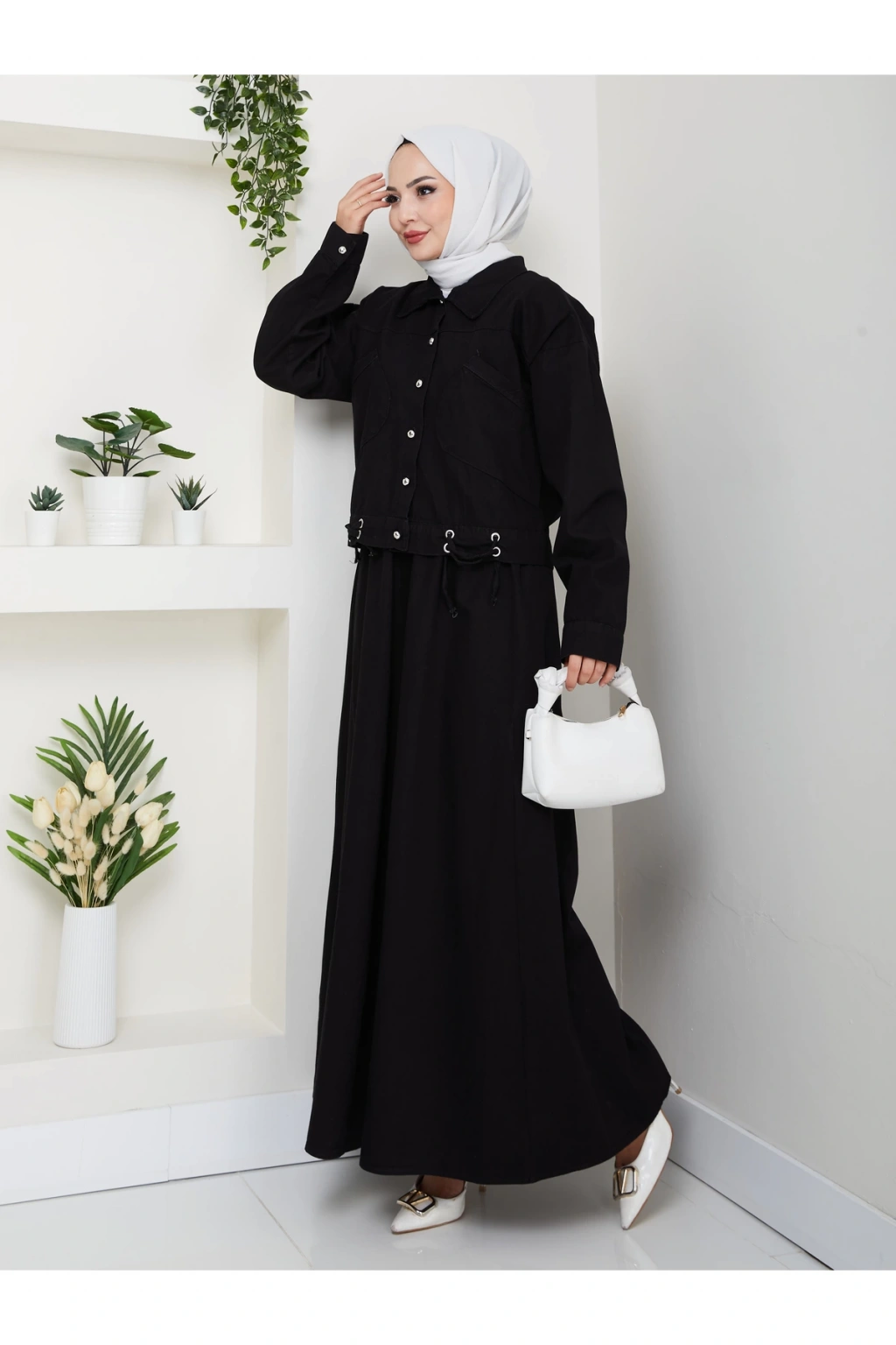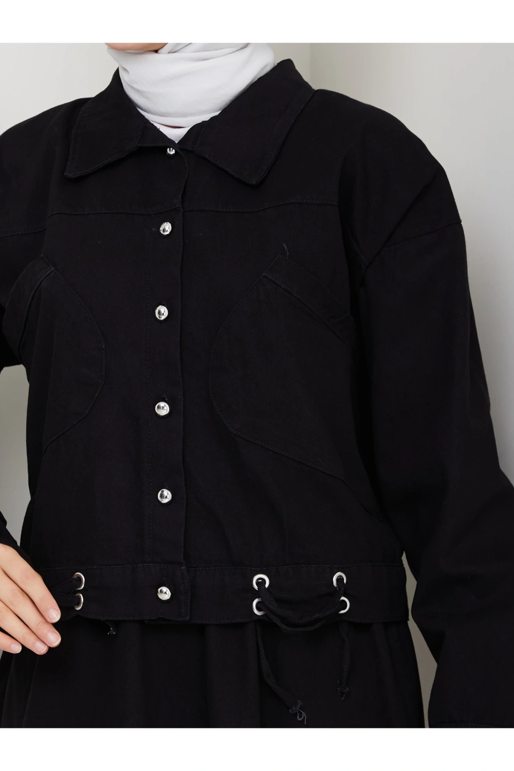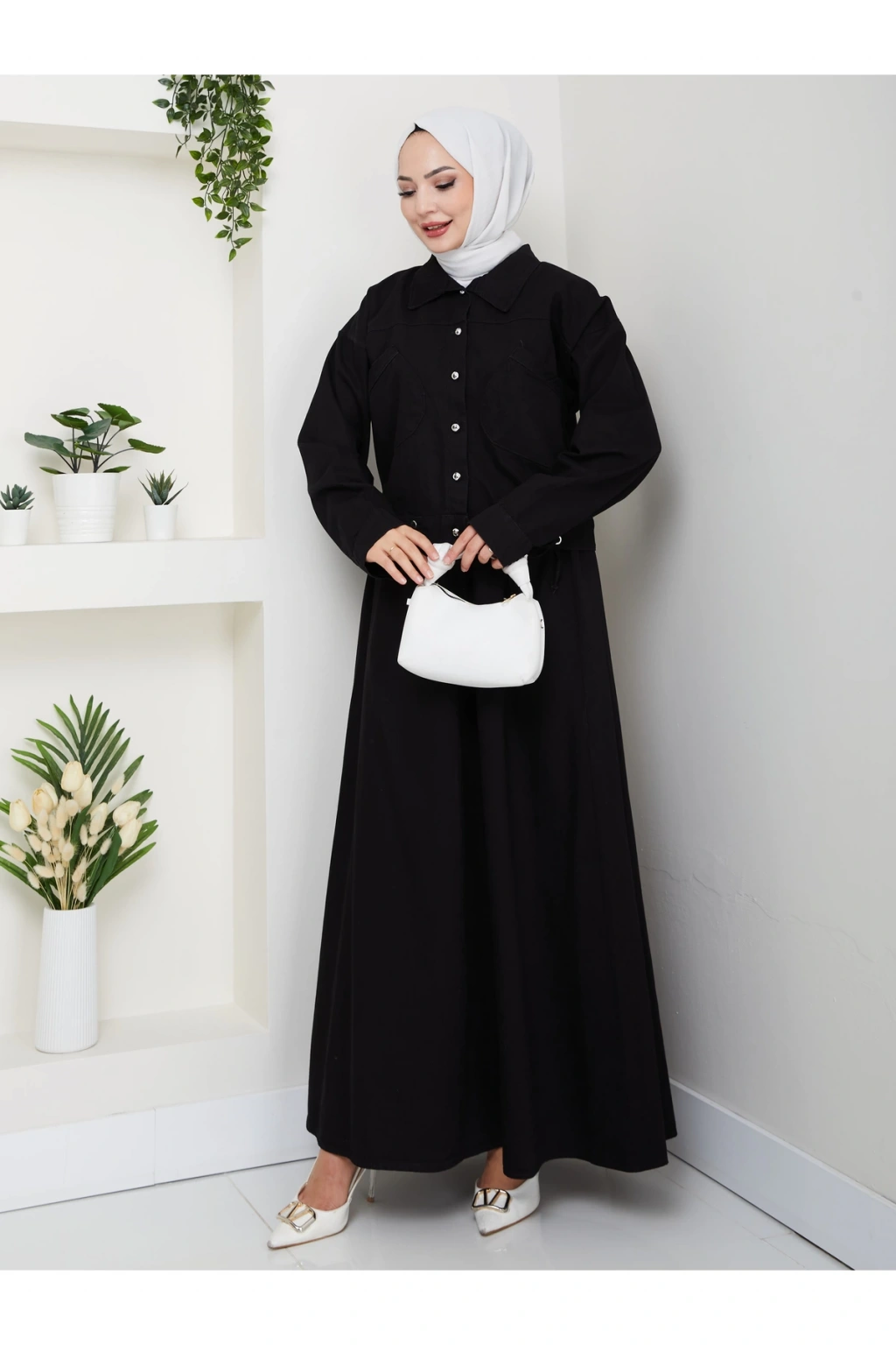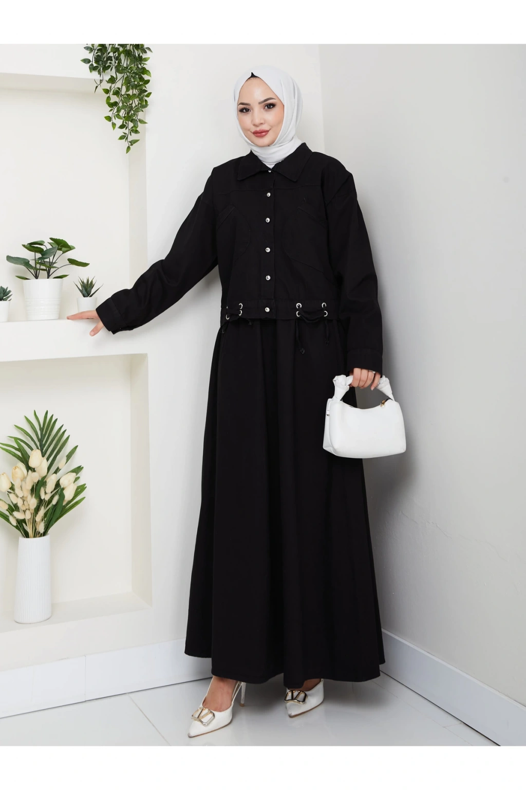 CEPLİ DETAYLİ SİYAH KOT TESETTÜR ETEKLİ TAKIM KOT KUMAŞ