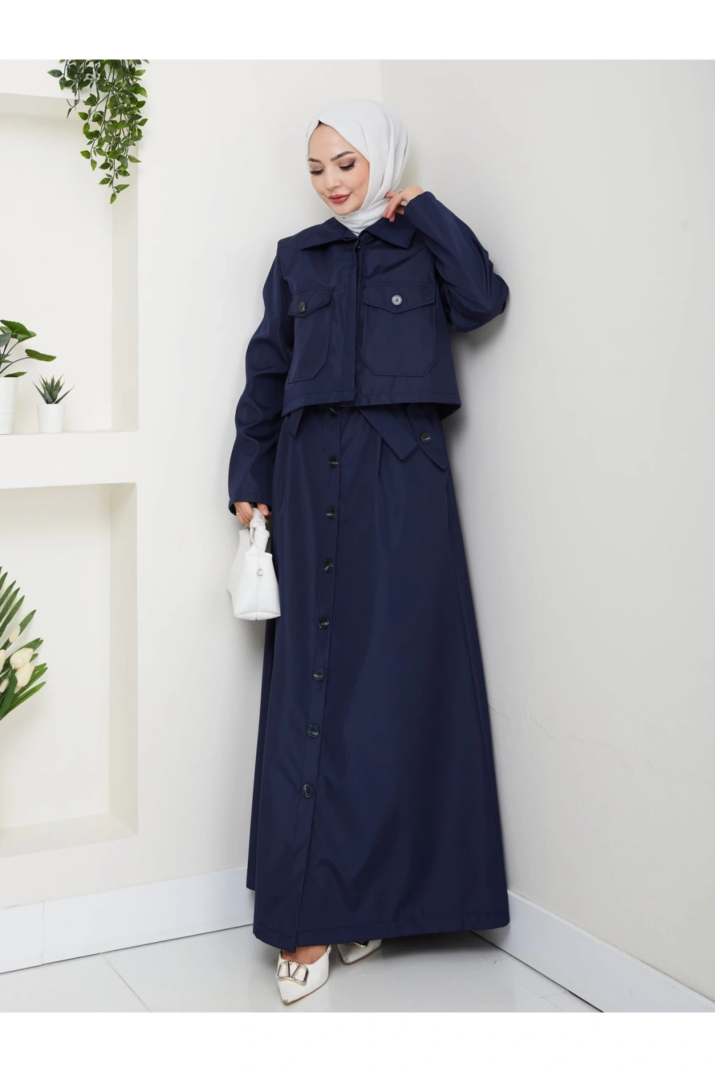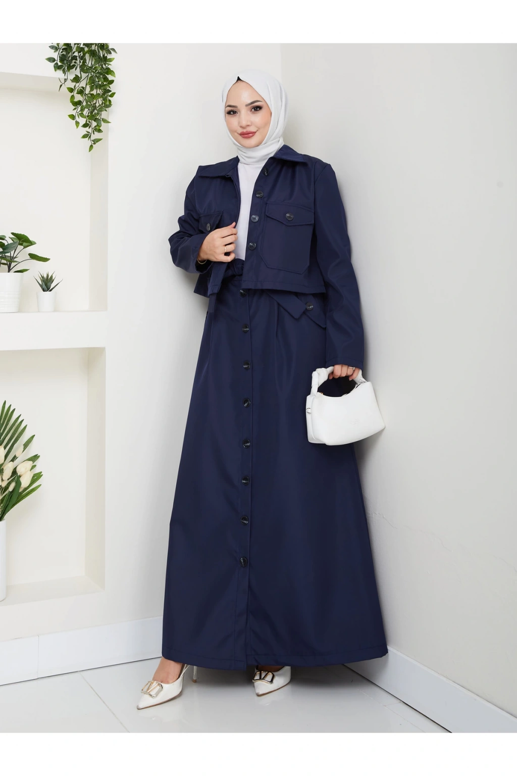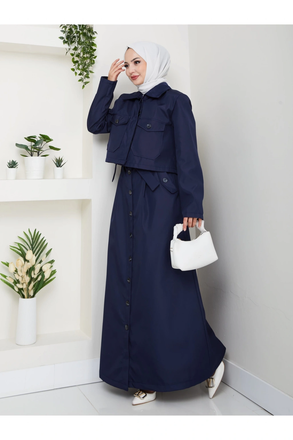 DÜĞMELİ DETAYLI CEPLİ TRENÇKOT ETEKLİ TAKIM TESETTÜR TAKIM LACİVERT