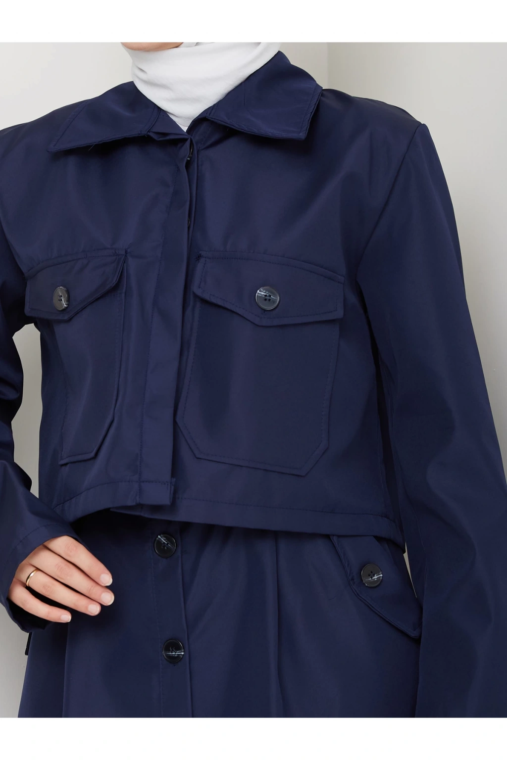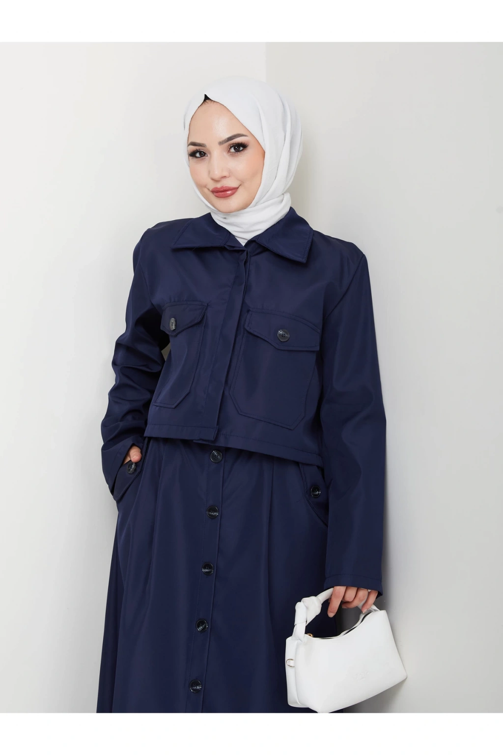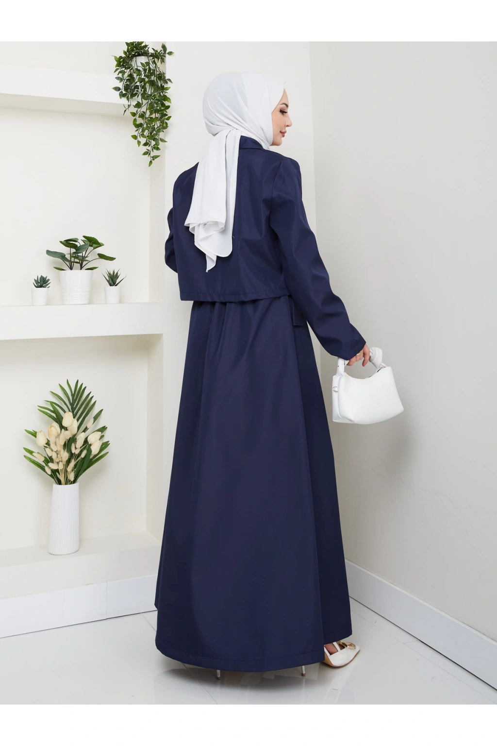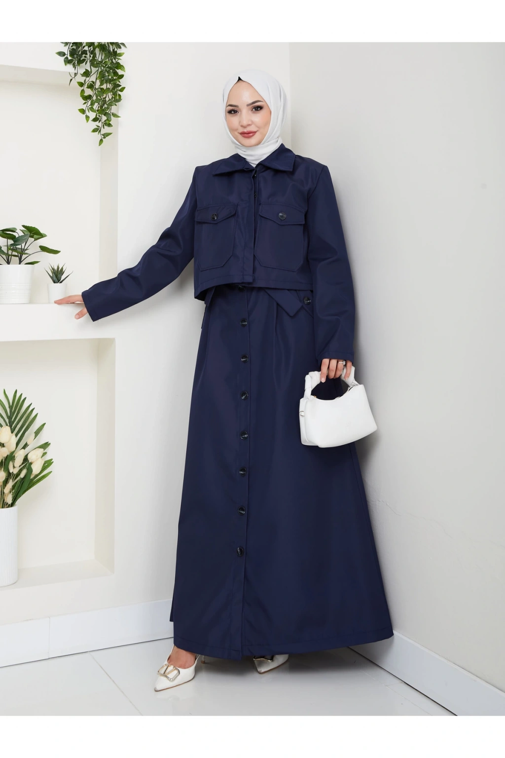 DÜĞMELİ DETAYLI CEPLİ TRENÇKOT ETEKLİ TAKIM TESETTÜR TAKIM LACİVERT