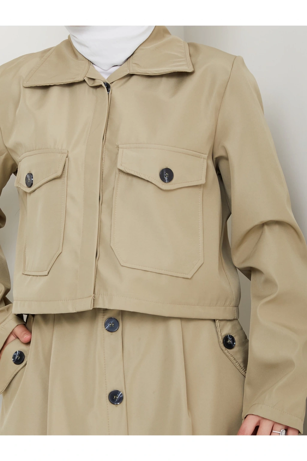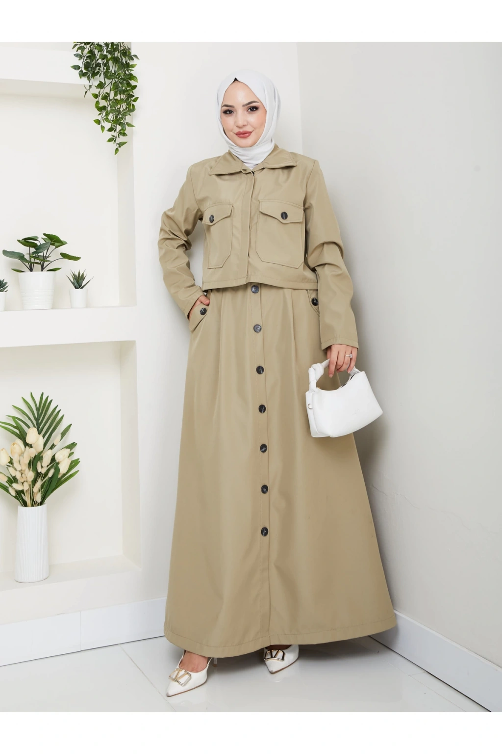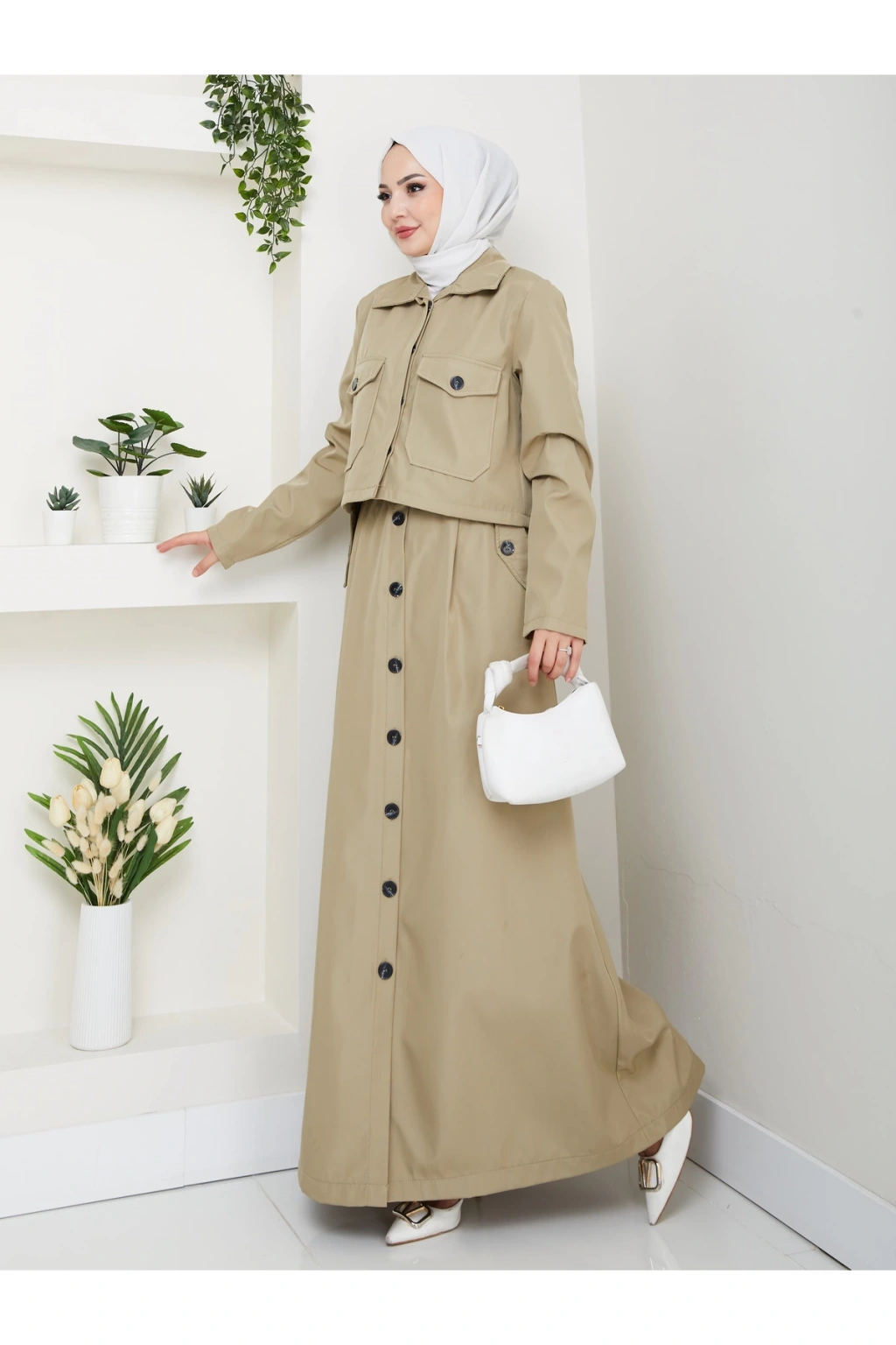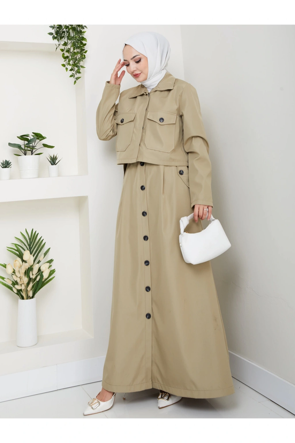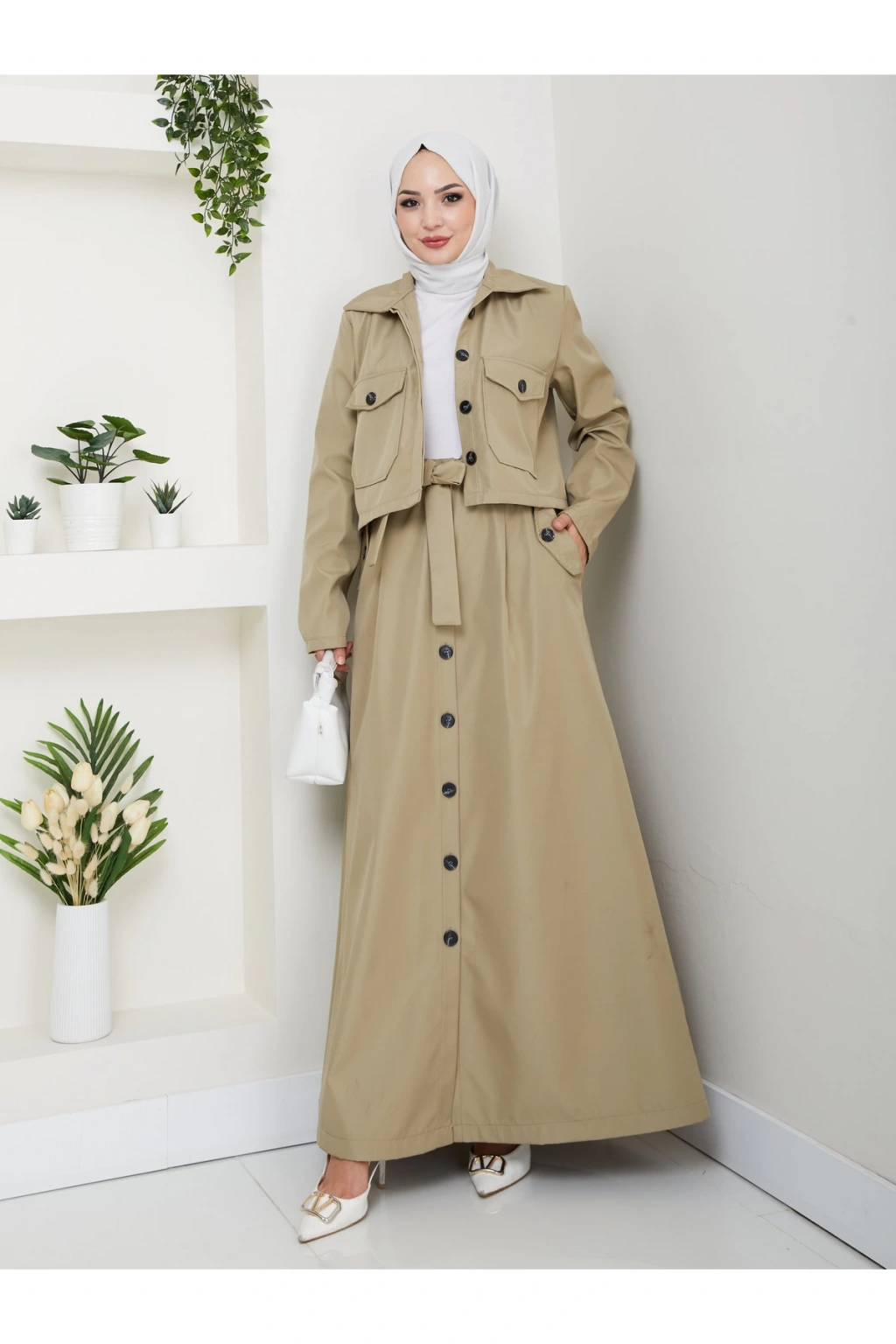DÜĞMELİ DETAYLI CEPLİ TRENÇKOT ETEKLİ TAKIM TESETTÜR TAKIM MİNT