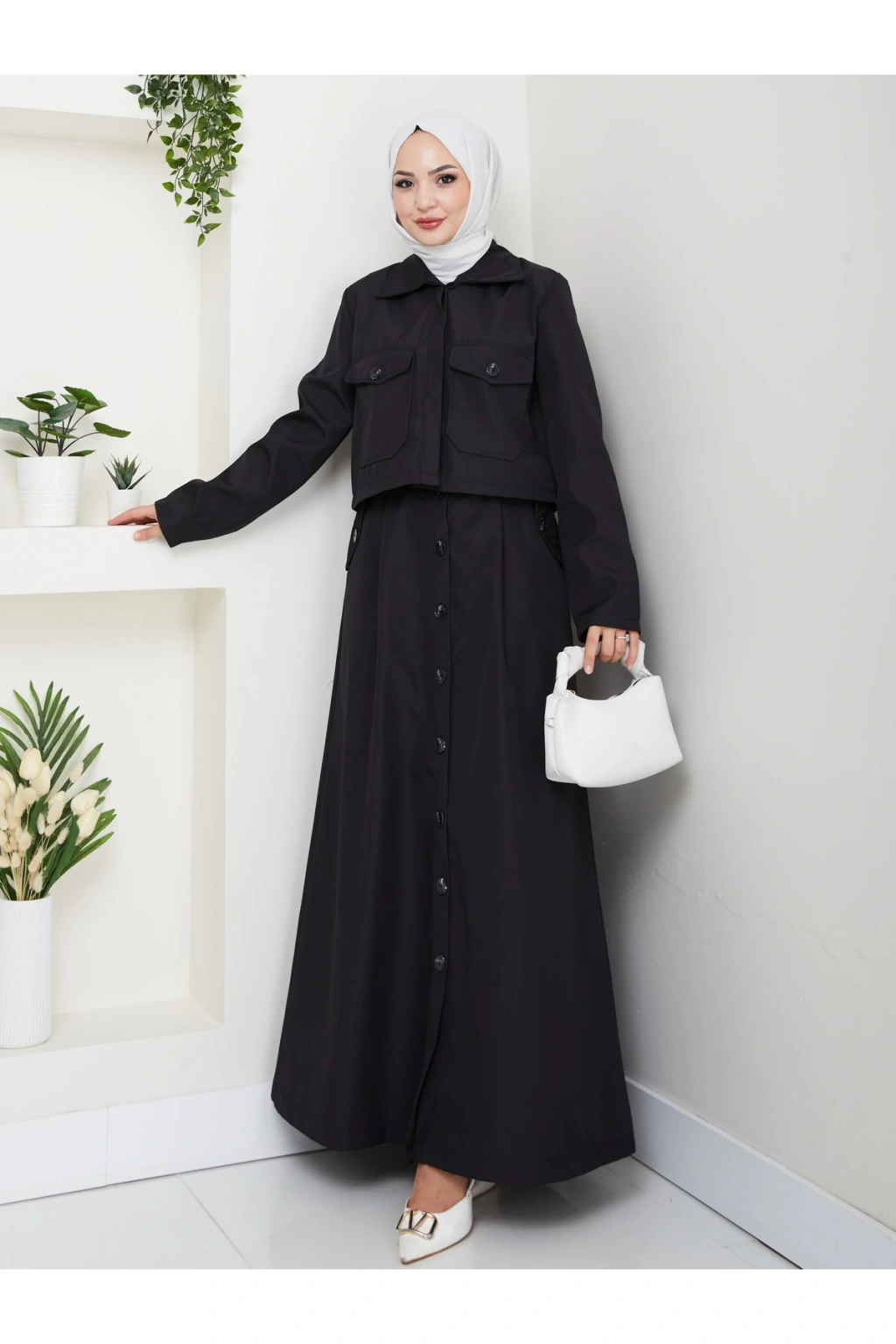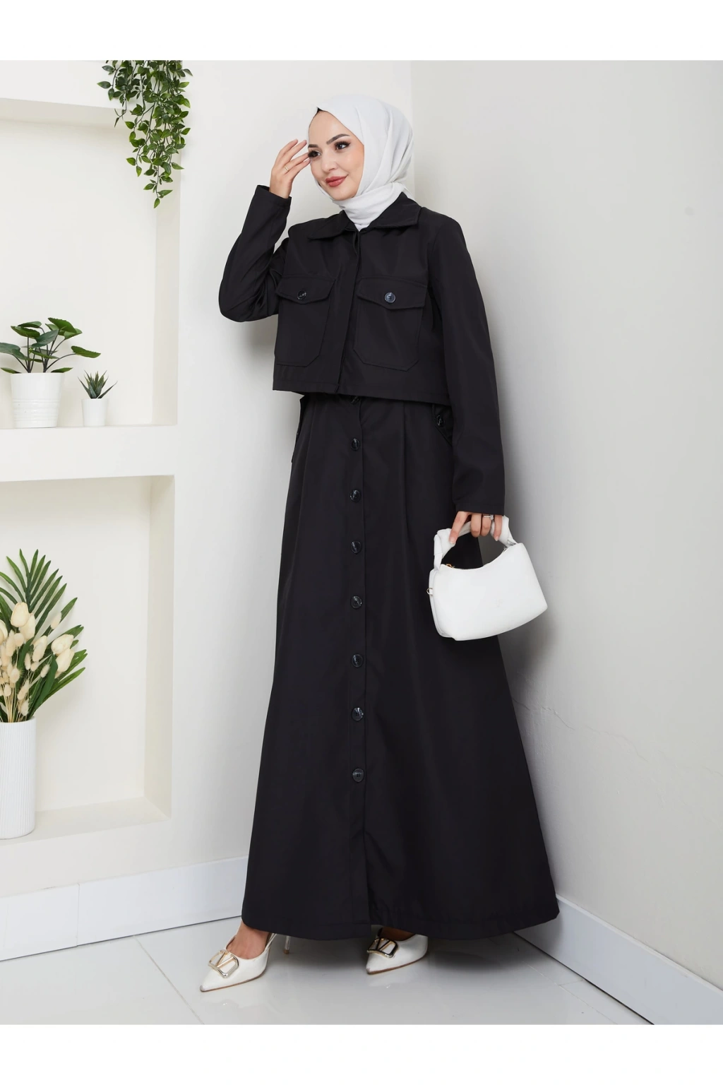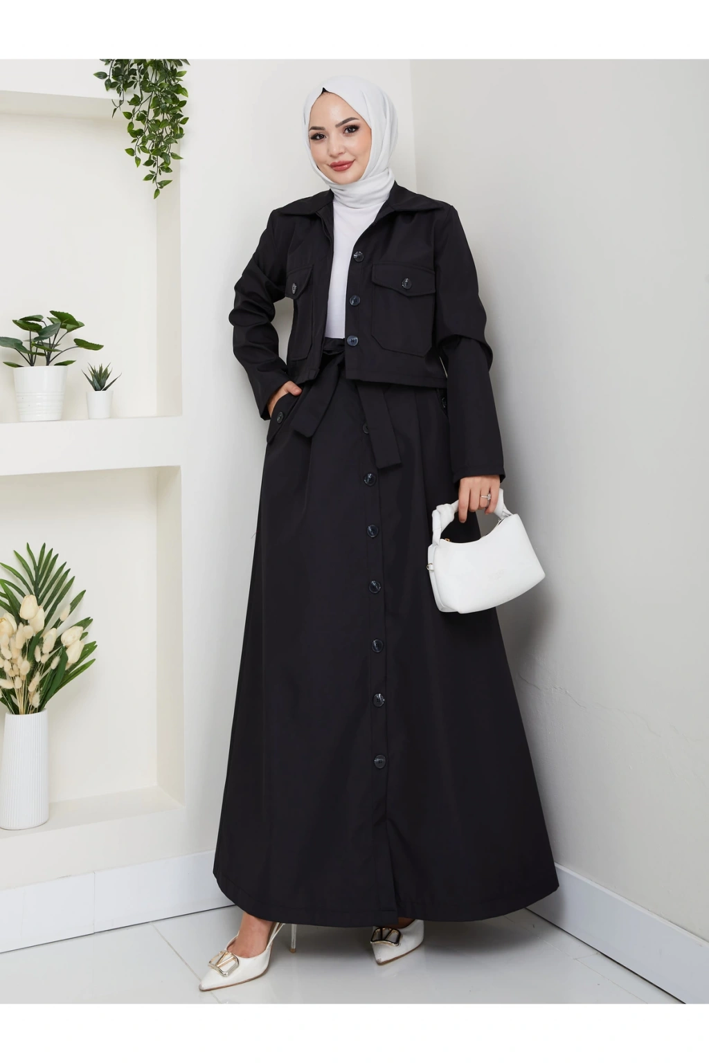 DÜĞMELİ DETAYLI CEPLİ TRENÇKOT ETEKLİ TAKIM TESETTÜR TAKIM SİYAH