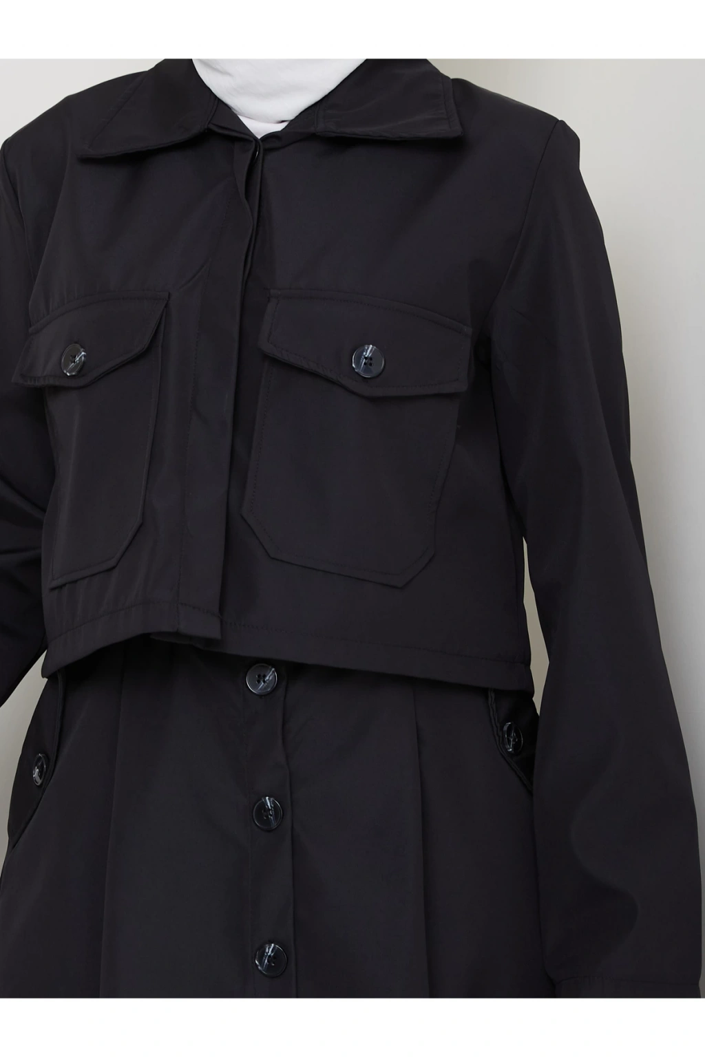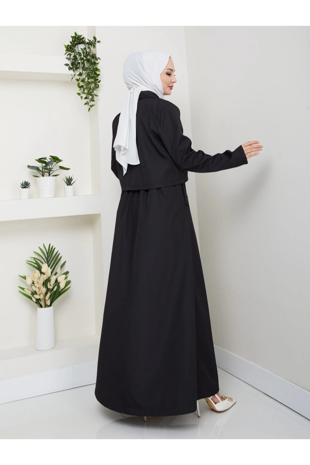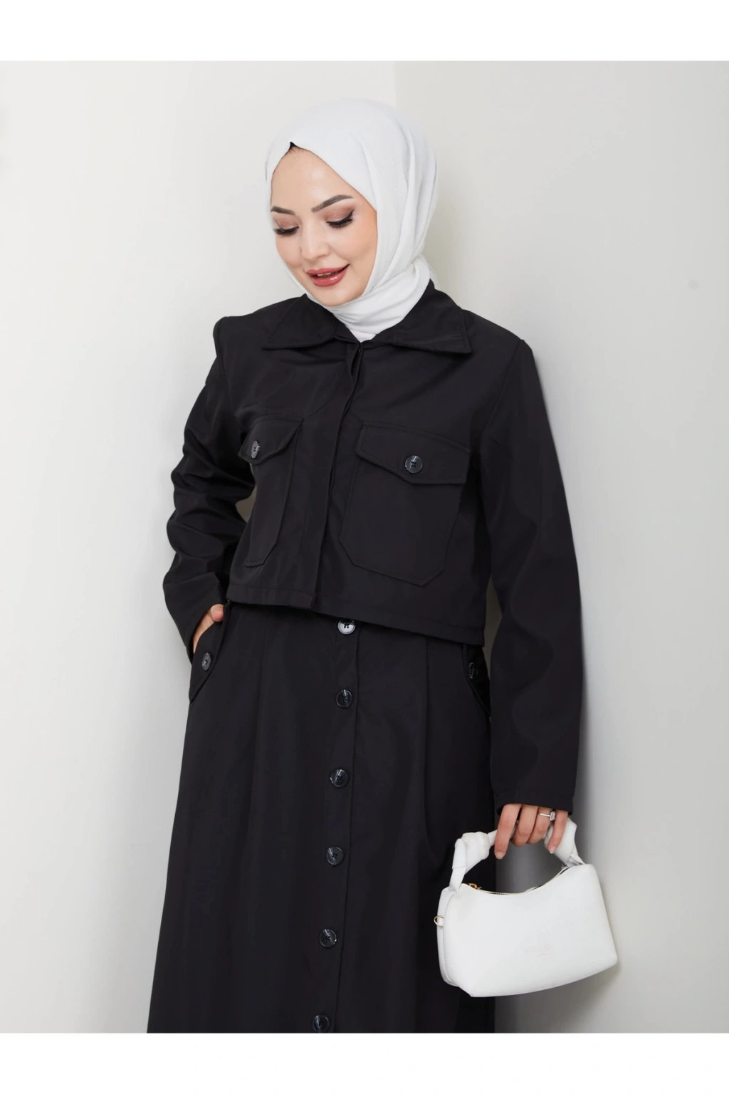 DÜĞMELİ DETAYLI CEPLİ TRENÇKOT ETEKLİ TAKIM TESETTÜR TAKIM SİYAH