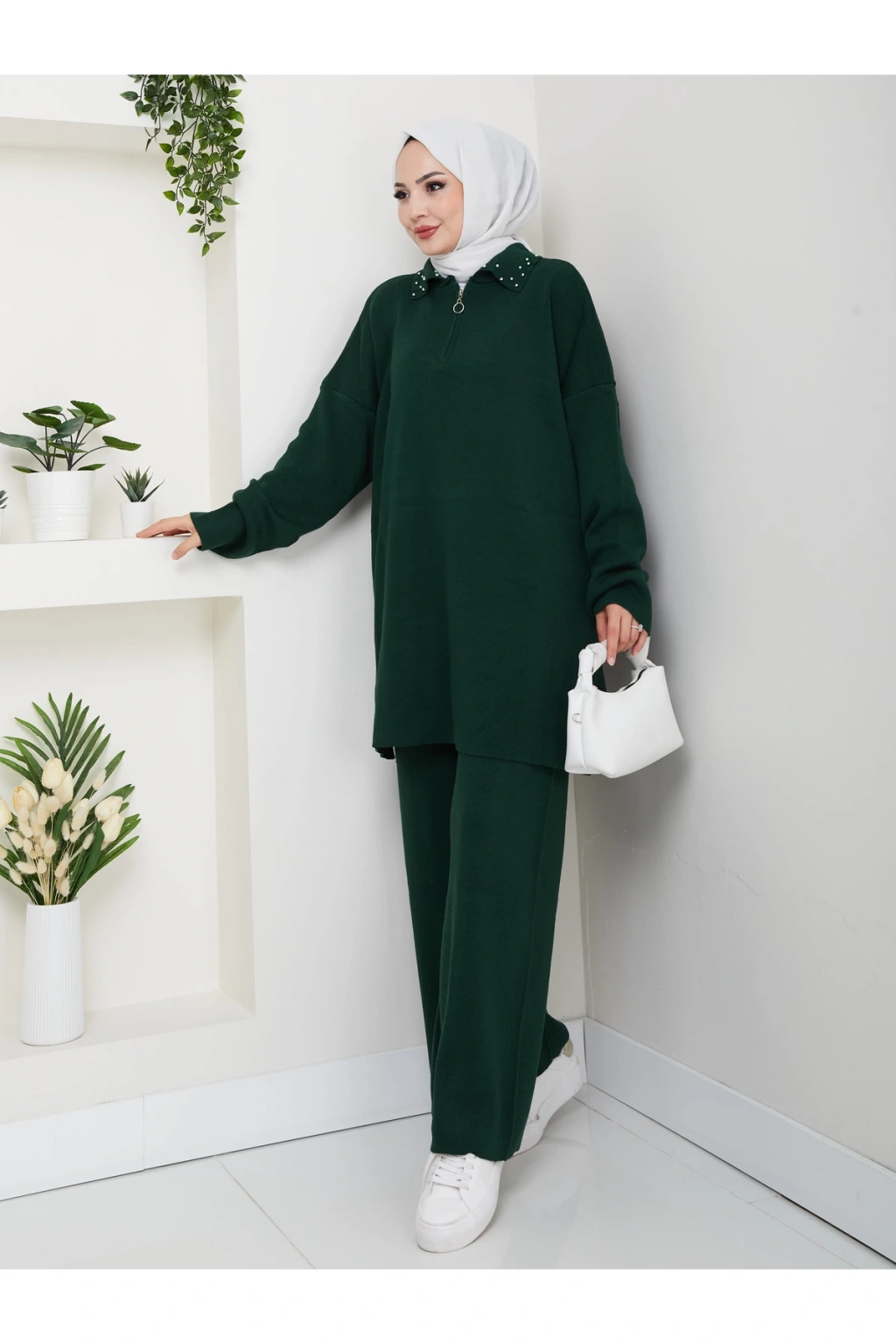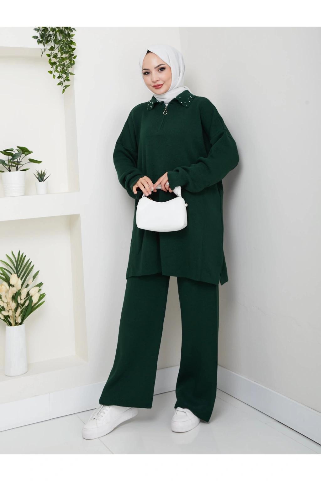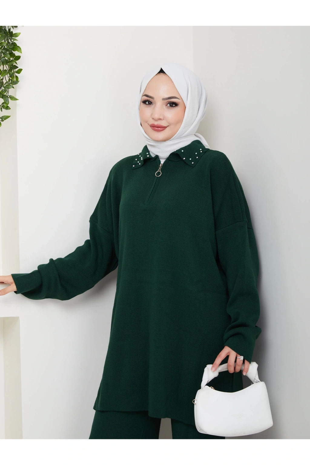 İNCİLİ GÖMLEK FERMUARLI YAKA TRİKO TAKIM ZÜMRÜT