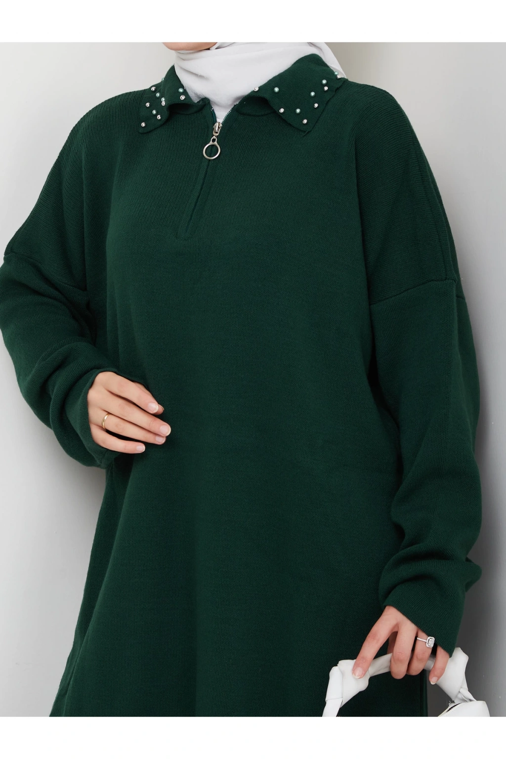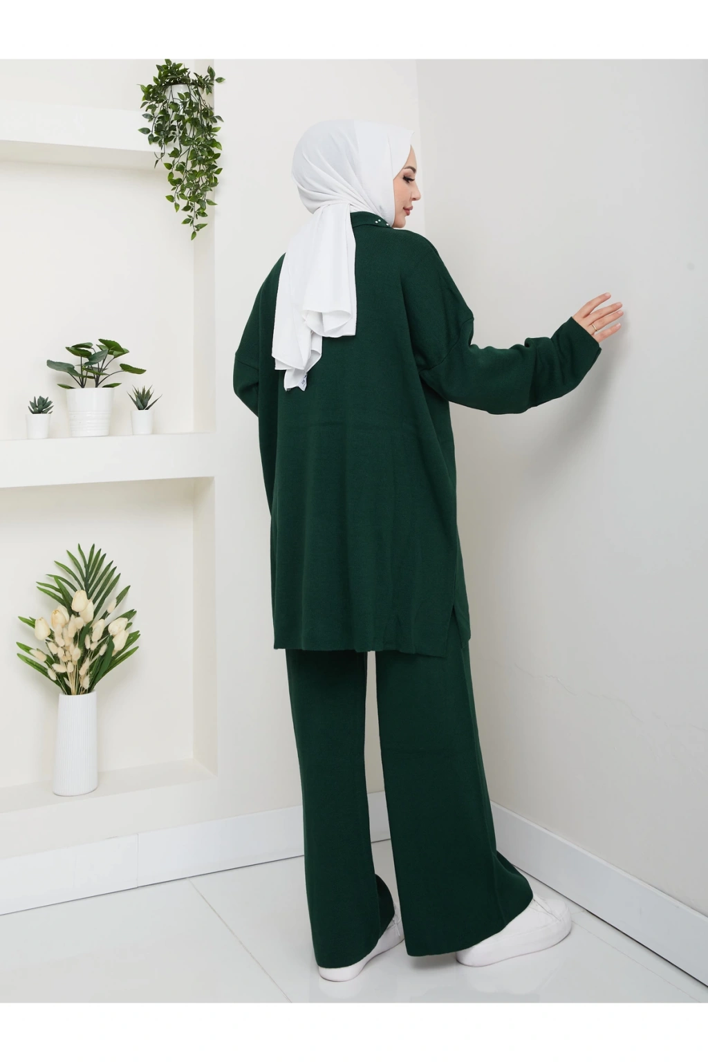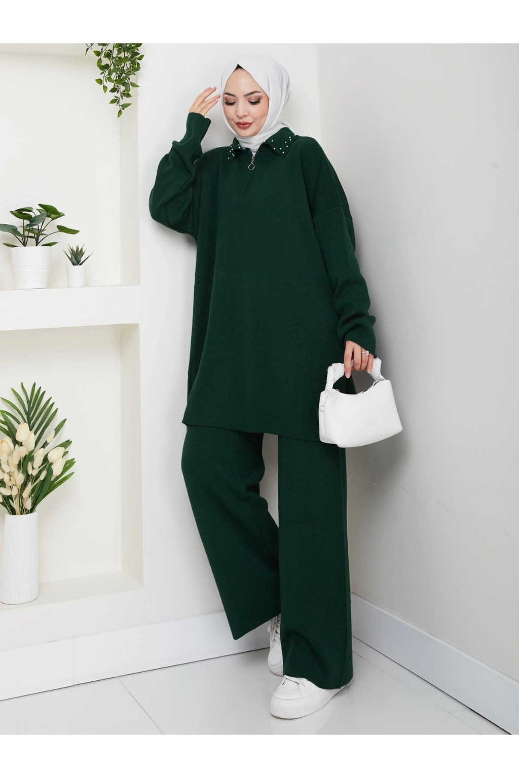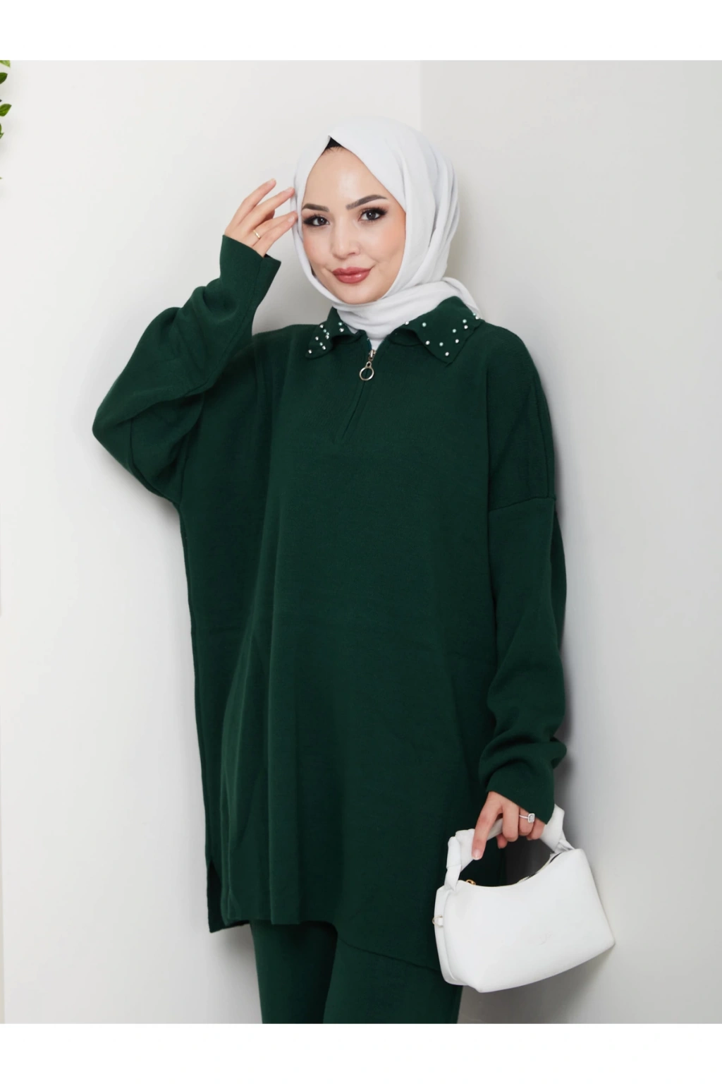 İNCİLİ GÖMLEK FERMUARLI YAKA TRİKO TAKIM ZÜMRÜT