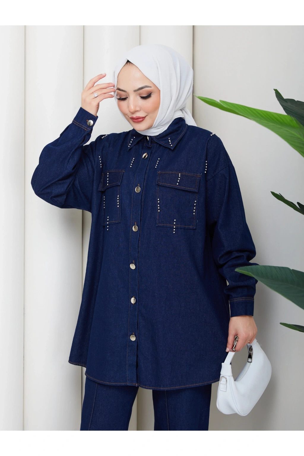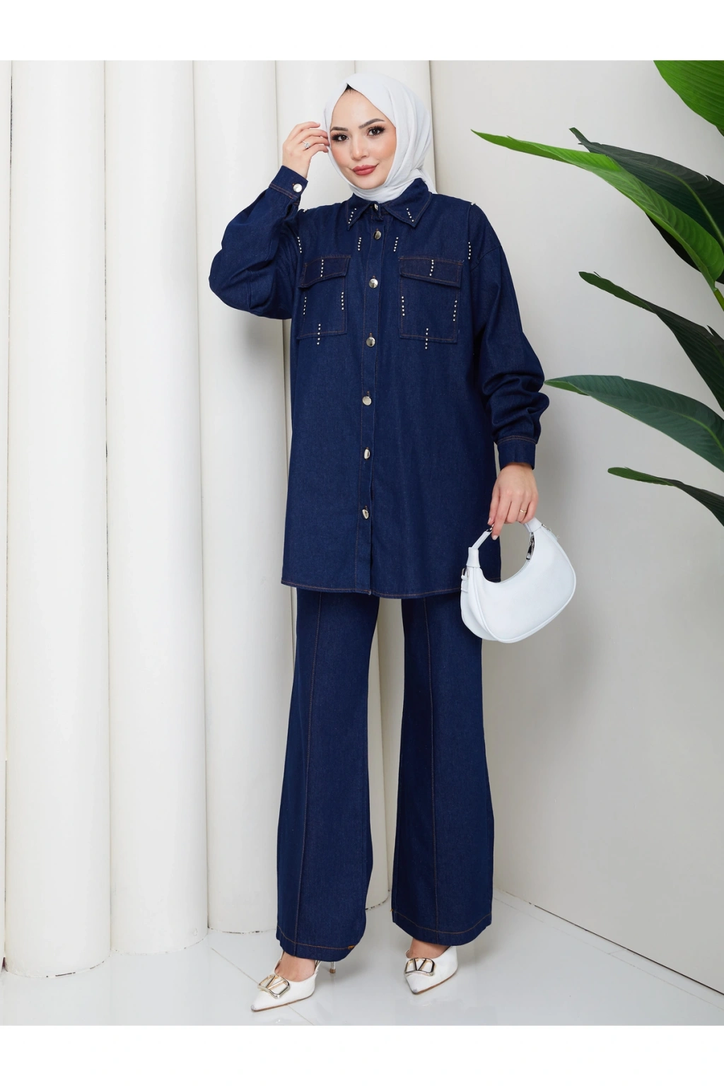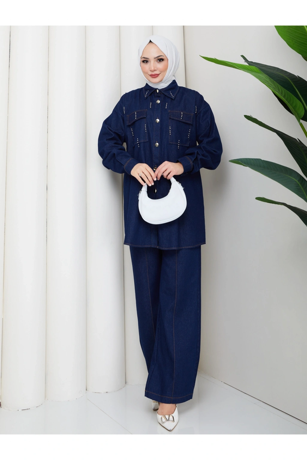 - Şık ve rahat bir kombin için ideal, kadın boncuk detaylı pantolonlu kot takım.; - Tesettür giyim koleksiyonuna özel tasarlanmış, günlük kullanım için uygun casual bir stil sunar.; - Kalın denim kumaşı ile tüm mevsimlerde konforlu bir deneyim sağlar.; - Düz deseni ve gömlek yakası ile sade ama şık bir görünüm elde edilir.; - Full düğme kapama özelliği sayesinde kolayca giyilip çıkarılabilir.; - Lastikli bel tasarımı ile gün boyu rahatlık ve esneklik sunar.; - Astarsız yapısı, hafif ve nefes alabilen bir kullanım imkanı tanır.; - Çift kapaklı cep detayları hem fonksiyonel hem de estetik bir dokunuş katar.; - Pamuk materyali cildinize nazik dokunuşlar sunarken geniş paça kesimi modern bir siluet oluşturur.; - Yıkamalı ek özelliği ile ürünün kullanım ömrünü uzatır ve yıpranmalara karşı dayanıklılık sağlar.; - Uzun boyu ve standart kol tipi ile klasik bir görünüm sergiler.; - Kemersiz tasarımı, farklı aksesuarlarla kişiselleştirme imkanı sunar.; - Türkiye'de üretilmiş olup, yerel üretim kalitesini yansıtır.;