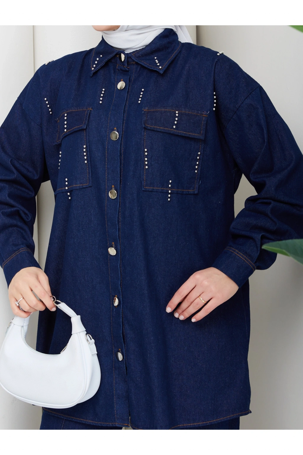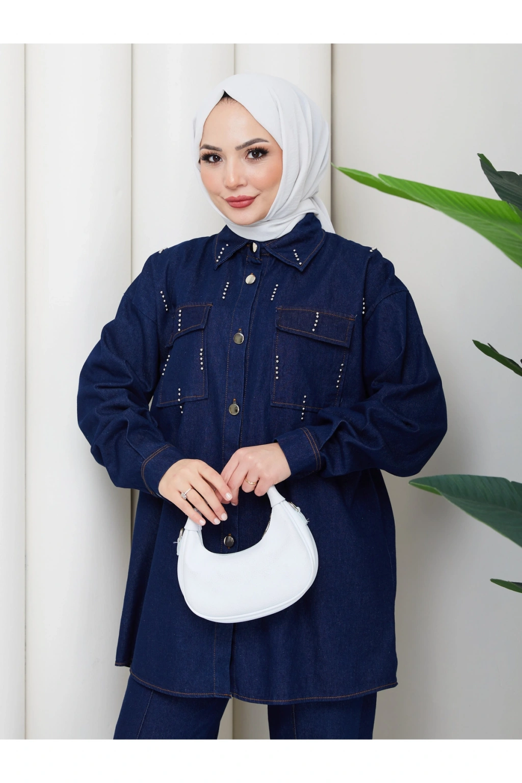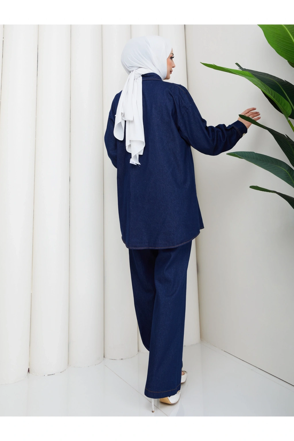 - Şık ve rahat bir kombin için ideal, kadın boncuk detaylı pantolonlu kot takım.; - Tesettür giyim koleksiyonuna özel tasarlanmış, günlük kullanım için uygun casual bir stil sunar.; - Kalın denim kumaşı ile tüm mevsimlerde konforlu bir deneyim sağlar.; - Düz deseni ve gömlek yakası ile sade ama şık bir görünüm elde edilir.; - Full düğme kapama özelliği sayesinde kolayca giyilip çıkarılabilir.; - Lastikli bel tasarımı ile gün boyu rahatlık ve esneklik sunar.; - Astarsız yapısı, hafif ve nefes alabilen bir kullanım imkanı tanır.; - Çift kapaklı cep detayları hem fonksiyonel hem de estetik bir dokunuş katar.; - Pamuk materyali cildinize nazik dokunuşlar sunarken geniş paça kesimi modern bir siluet oluşturur.; - Yıkamalı ek özelliği ile ürünün kullanım ömrünü uzatır ve yıpranmalara karşı dayanıklılık sağlar.; - Uzun boyu ve standart kol tipi ile klasik bir görünüm sergiler.; - Kemersiz tasarımı, farklı aksesuarlarla kişiselleştirme imkanı sunar.; - Türkiye'de üretilmiş olup, yerel üretim kalitesini yansıtır.;