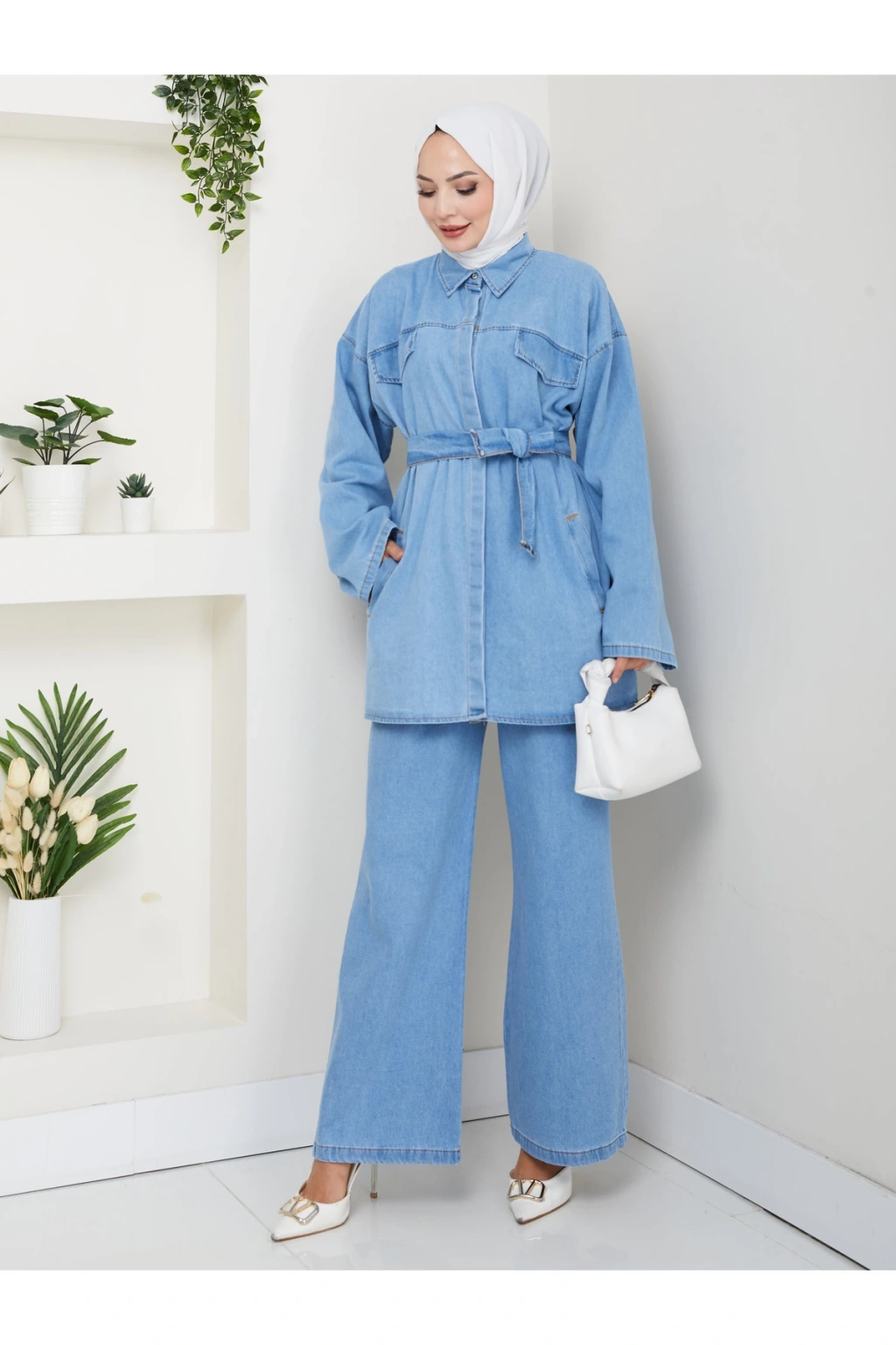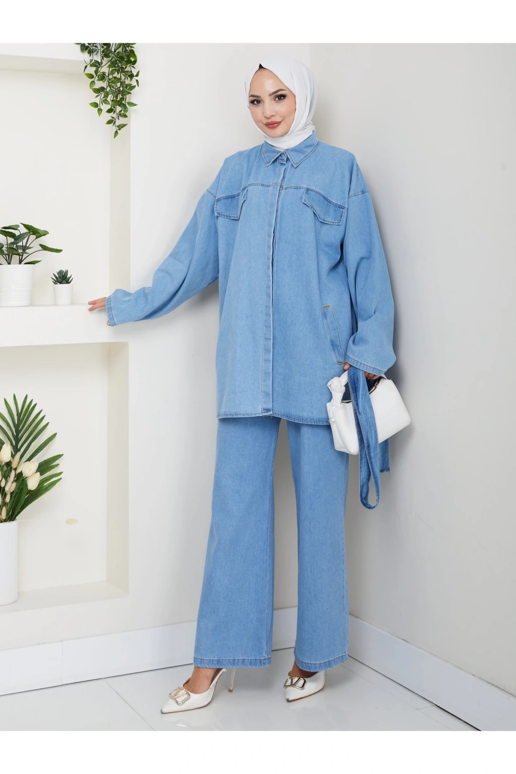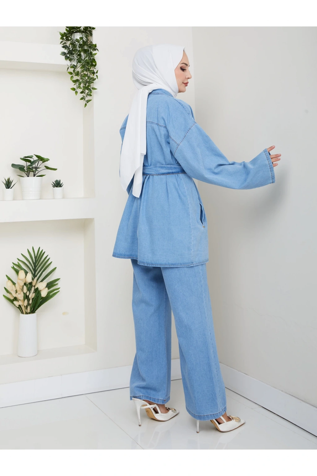 KADIN CEP DETAYLI KÜŞAKLI DENİM CEKET PANTALON TAKIM JEAN PREMİUM