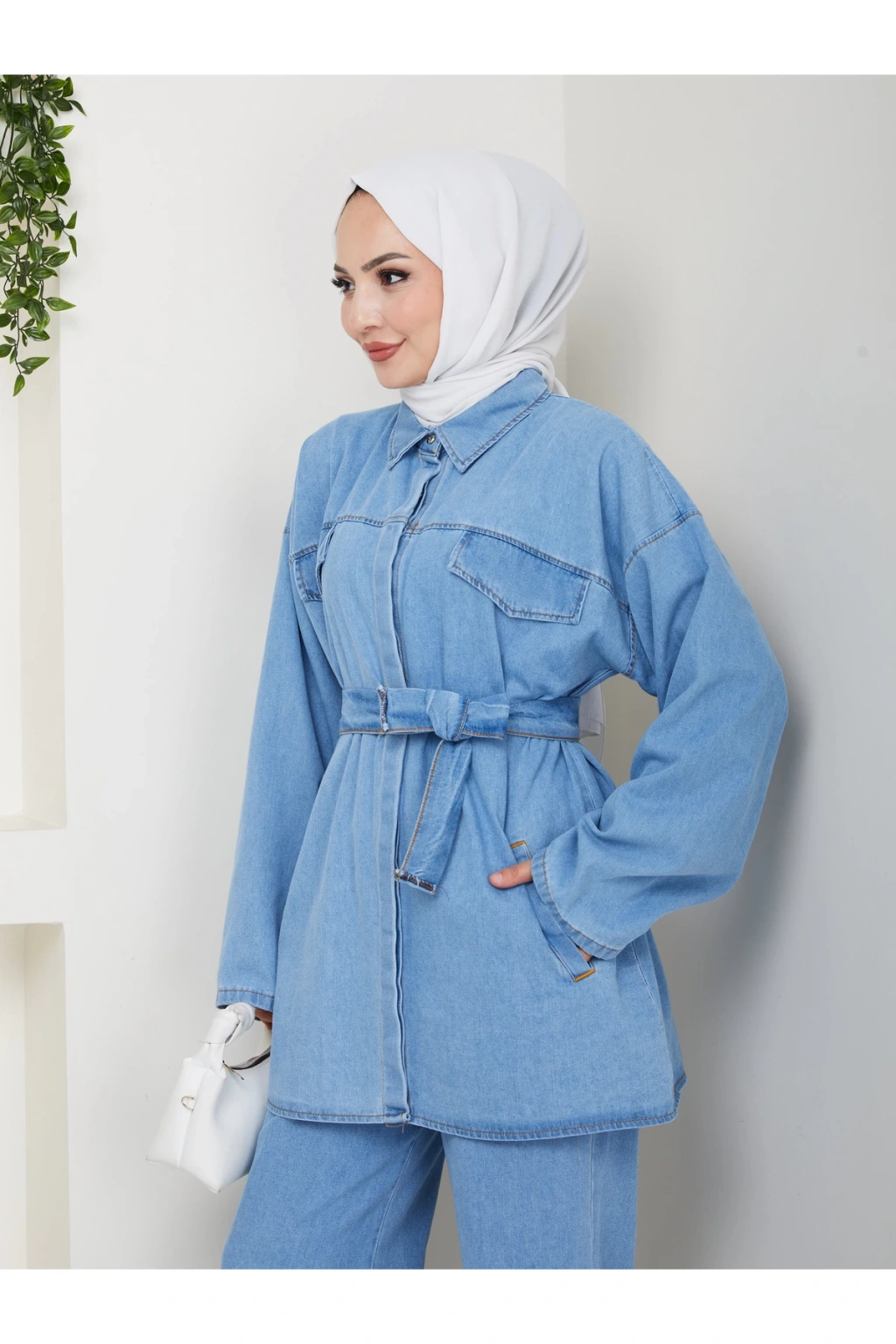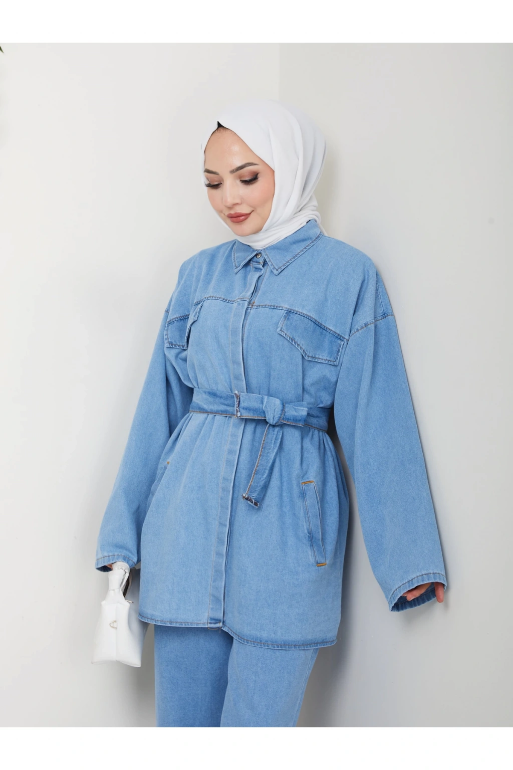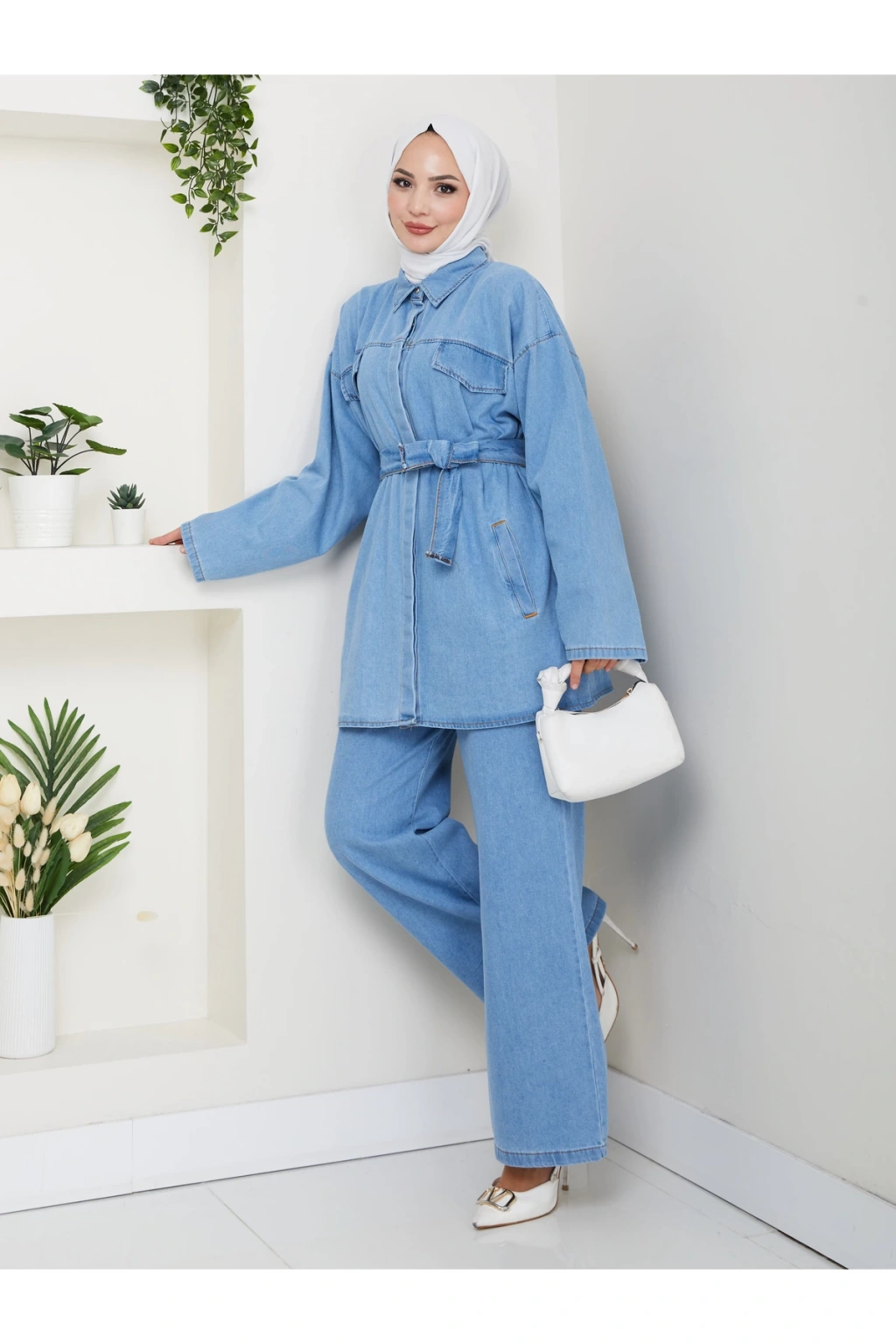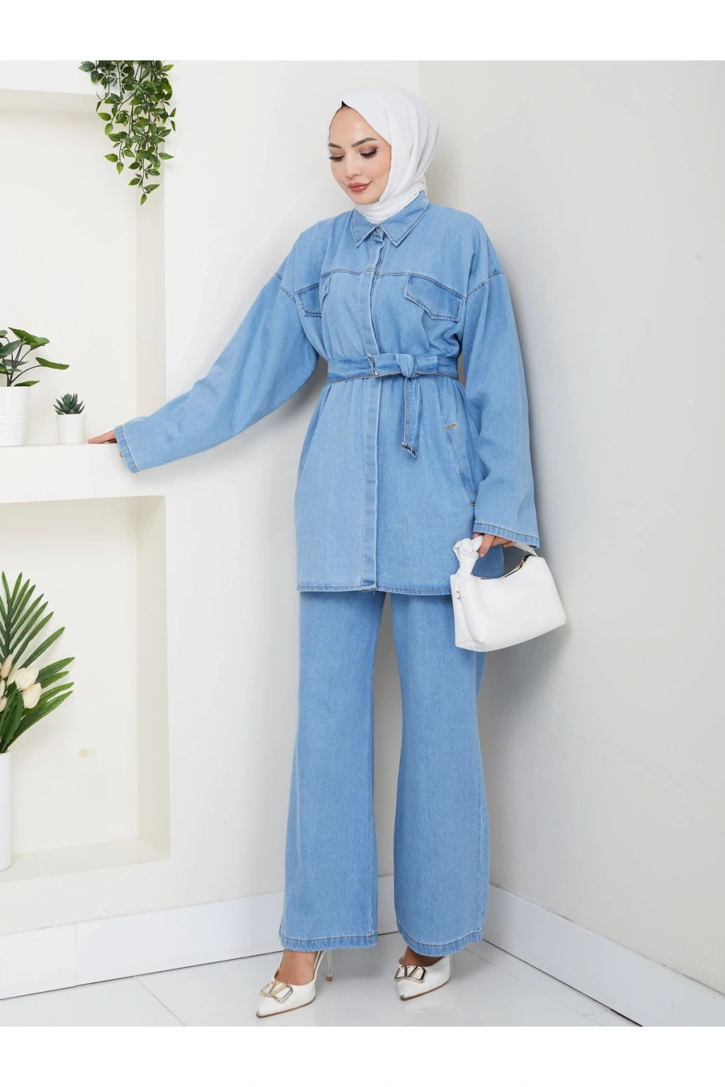 KADIN CEP DETAYLI KÜŞAKLI DENİM CEKET PANTALON TAKIM JEAN PREMİUM