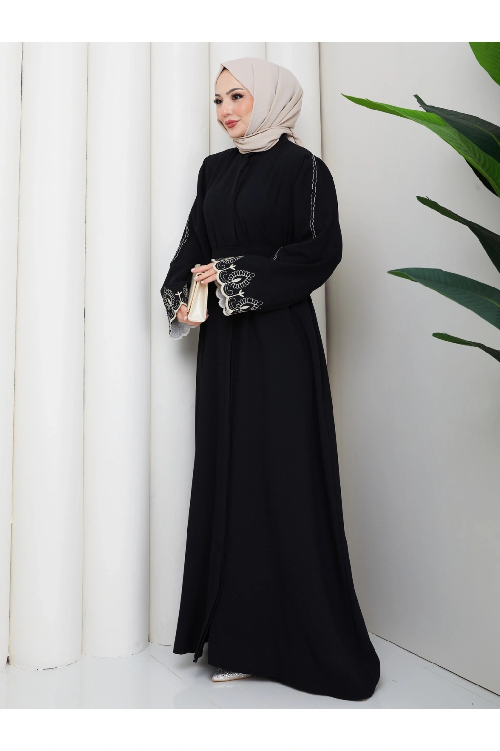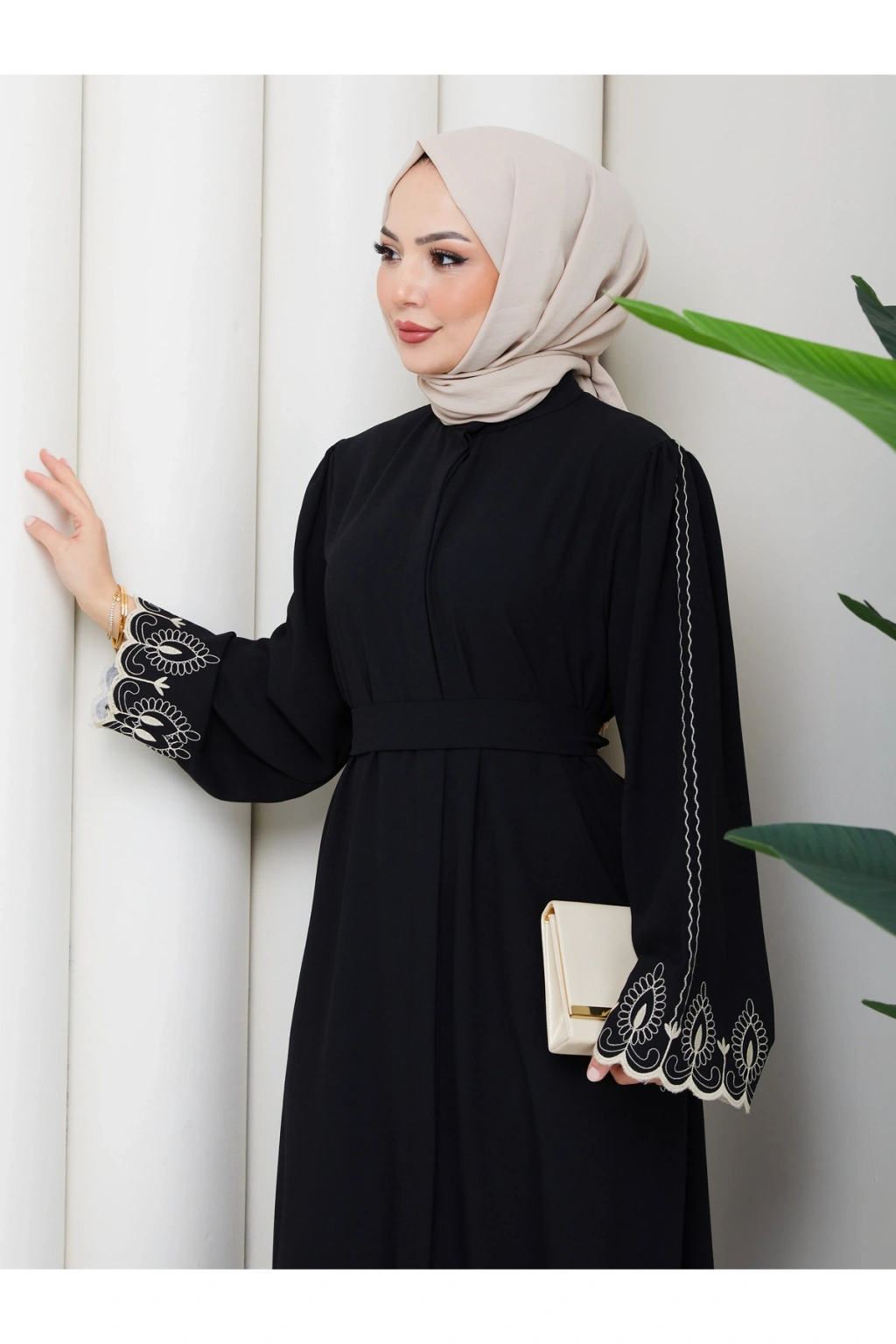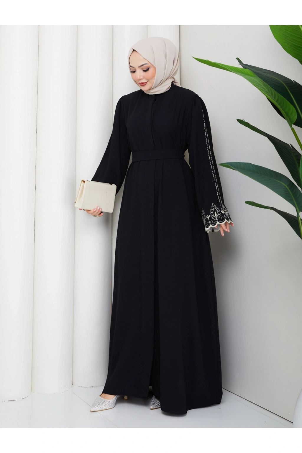 - Modern ve şık tasarımıyla dikkat çeken kadın abaya, tesettür giyim tarzınıza zarif bir dokunuş katıyor.; - Kol detaylarındaki nakış işçiliği ile göz alıcı bir görünüm sunuyor.; - Rahat kalıbı sayesinde gün boyu konforlu bir kullanım sağlıyor.; - Tesettür giyim için ideal olan bu ferace elbise, hem günlük hem de özel günlerde tercih edilebiliyor.; - Kolu nakışlı tasarımıyla farklılık yaratırken, elbiselerinize estetik bir hava katıyor.;