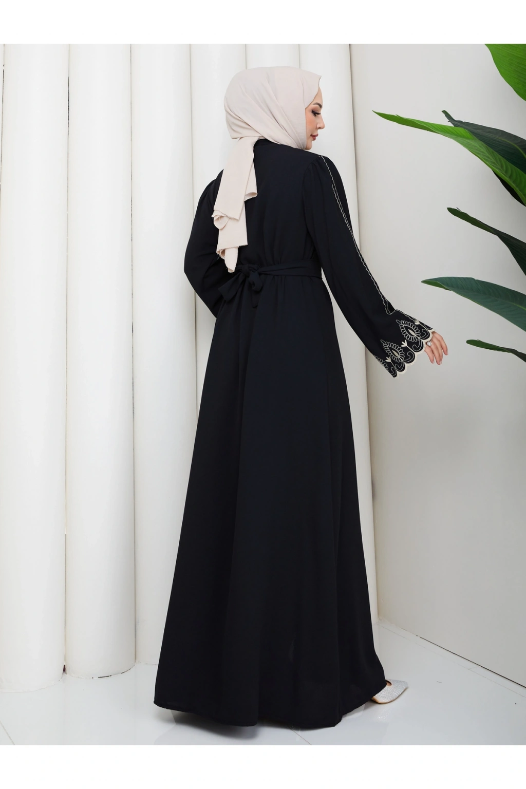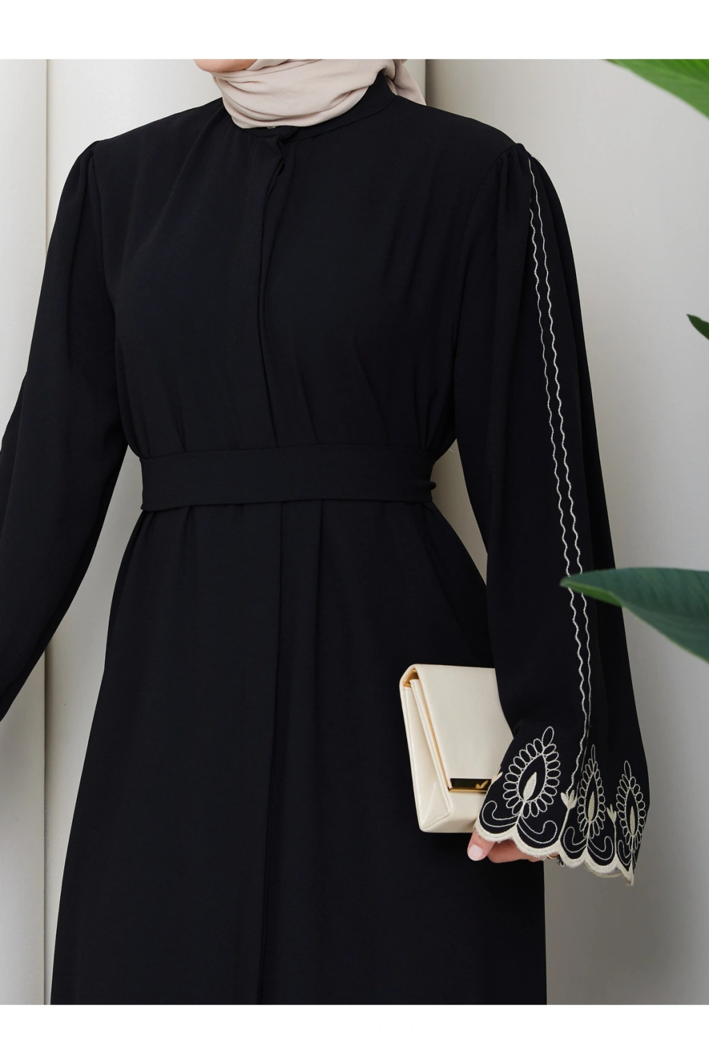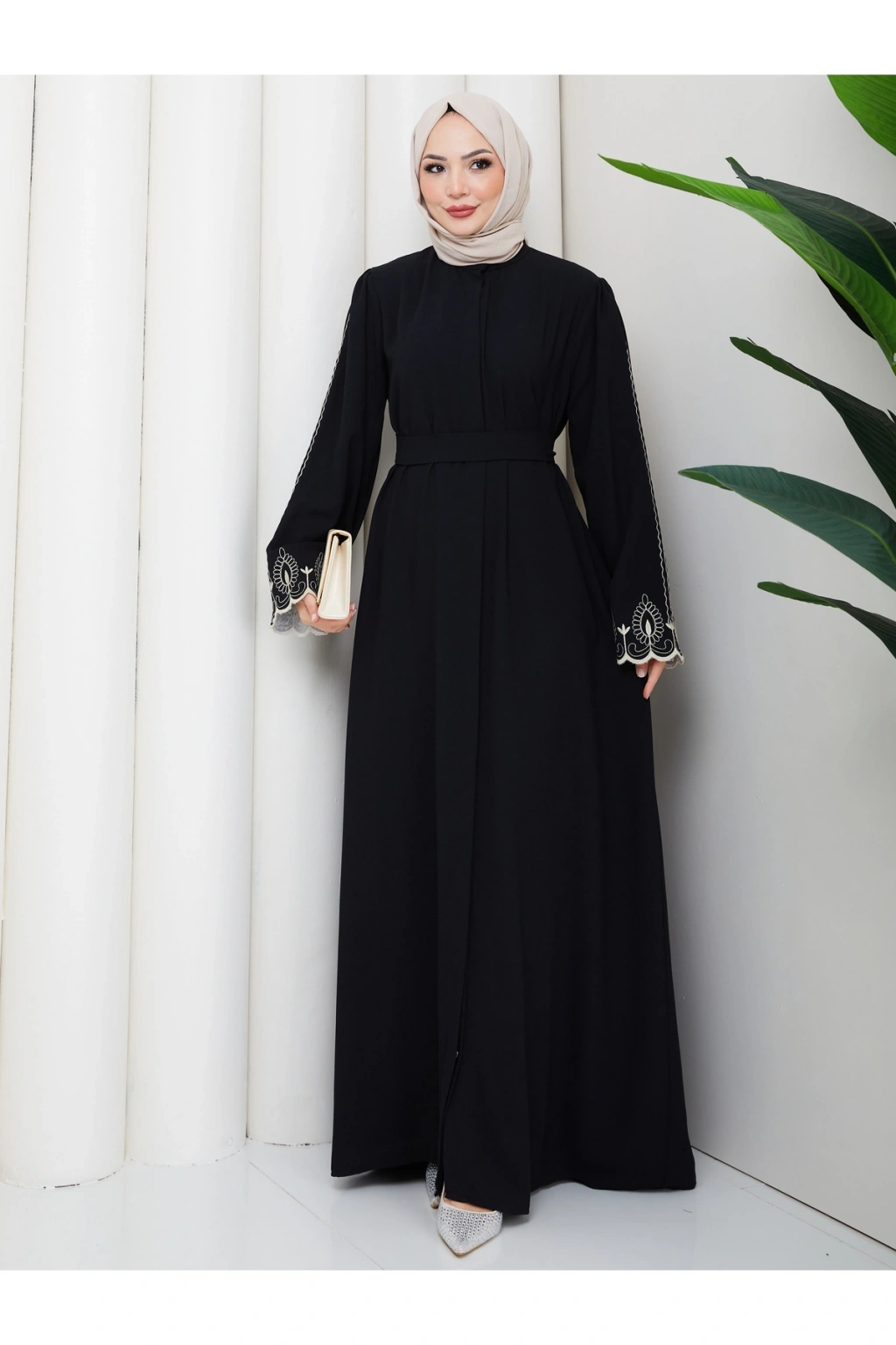 - Modern ve şık tasarımıyla dikkat çeken kadın abaya, tesettür giyim tarzınıza zarif bir dokunuş katıyor.; - Kol detaylarındaki nakış işçiliği ile göz alıcı bir görünüm sunuyor.; - Rahat kalıbı sayesinde gün boyu konforlu bir kullanım sağlıyor.; - Tesettür giyim için ideal olan bu ferace elbise, hem günlük hem de özel günlerde tercih edilebiliyor.; - Kolu nakışlı tasarımıyla farklılık yaratırken, elbiselerinize estetik bir hava katıyor.;