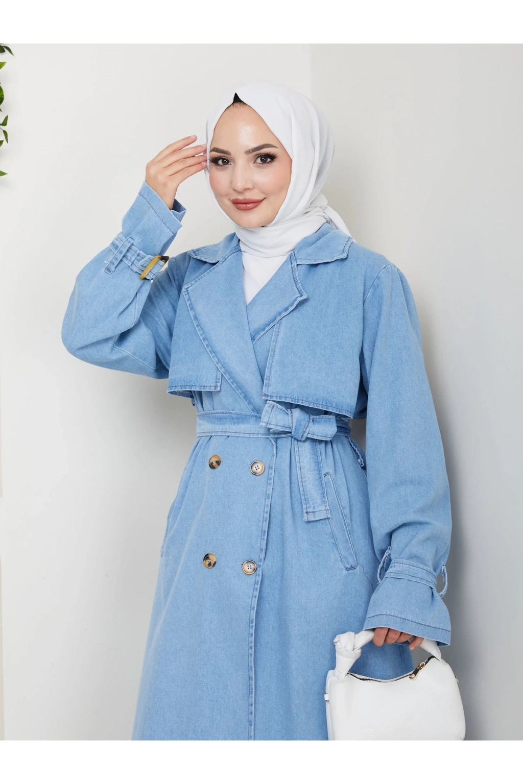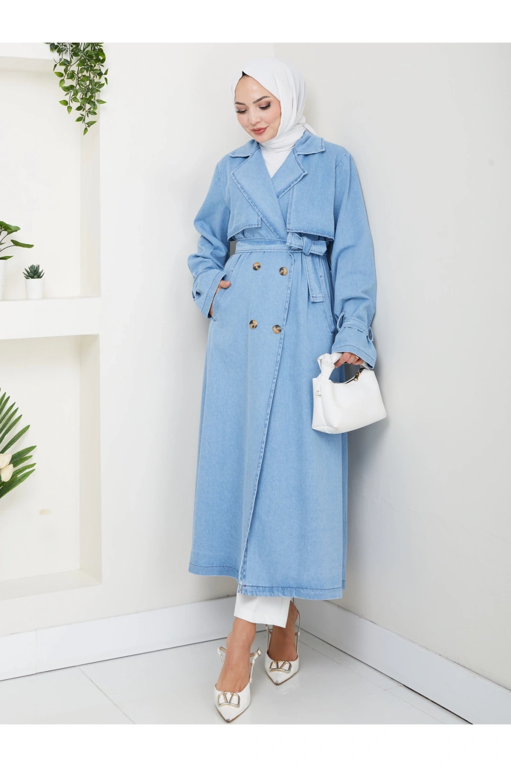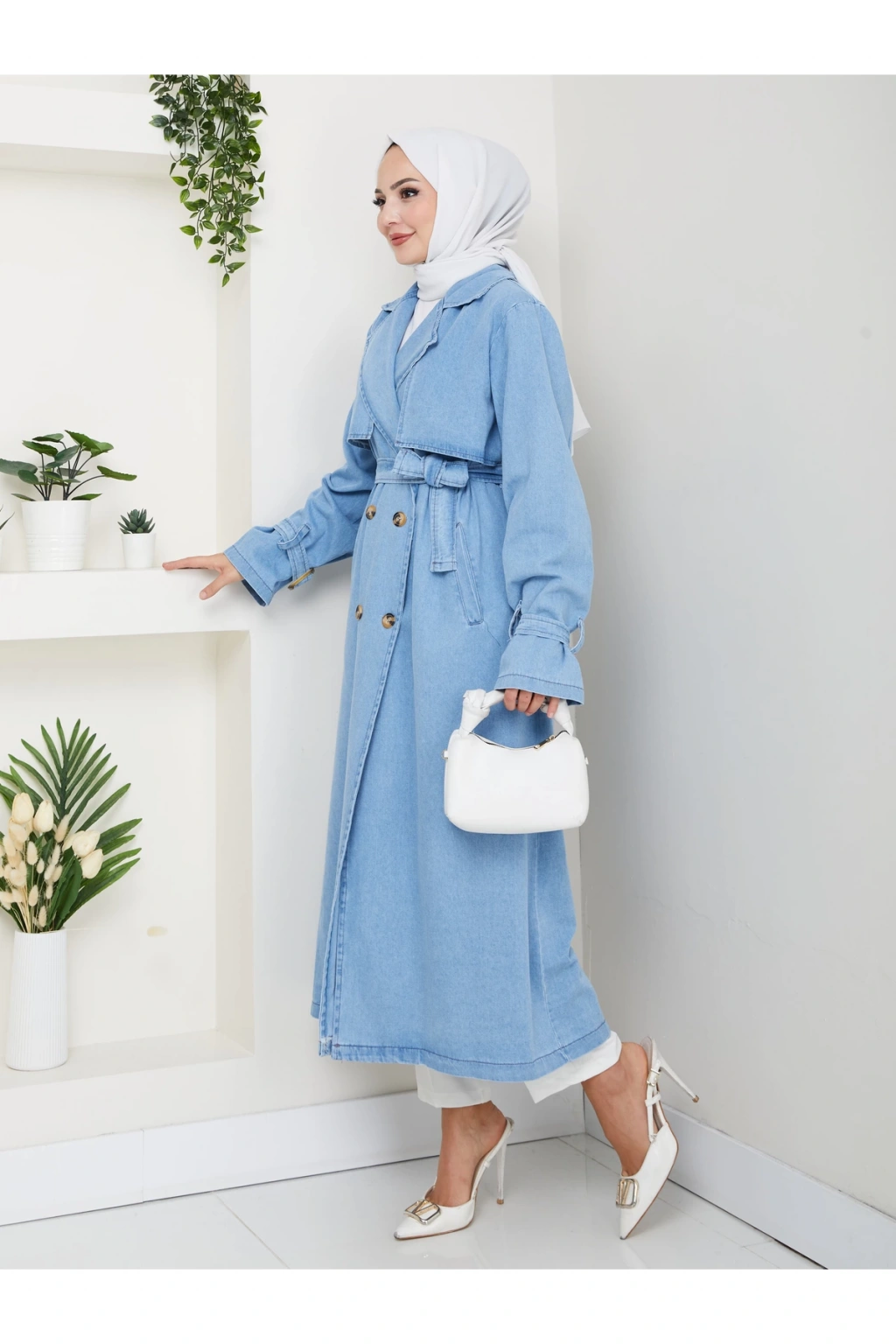 KADIN KRUVAZE YAKA DENİM TRENÇKOT UZUN 125 CM KOT KUMAŞ
