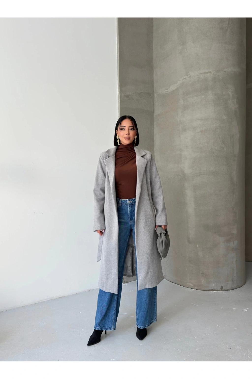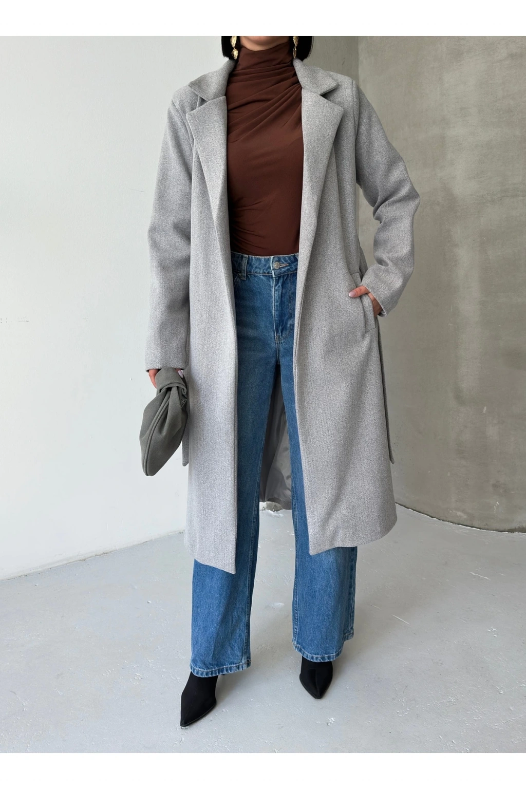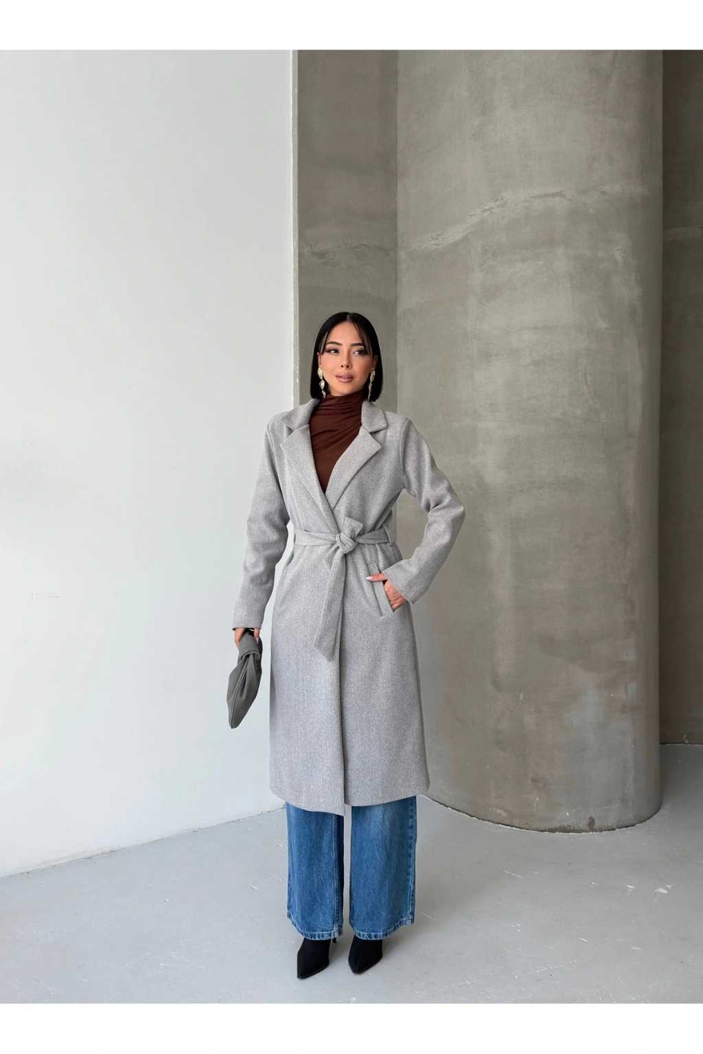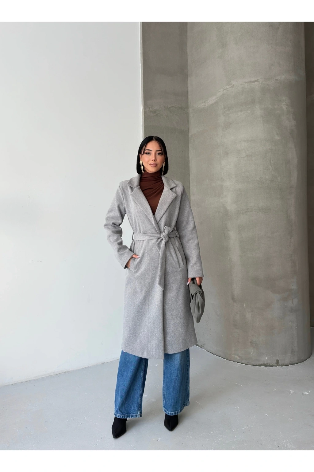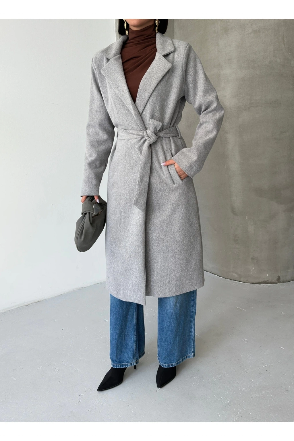 KADIN KUŞAKLI CEPLİ ASTARLI UZUN KAŞE KABAN [ TÜYLENMEZ ]