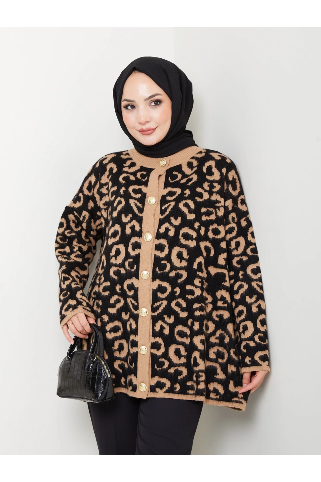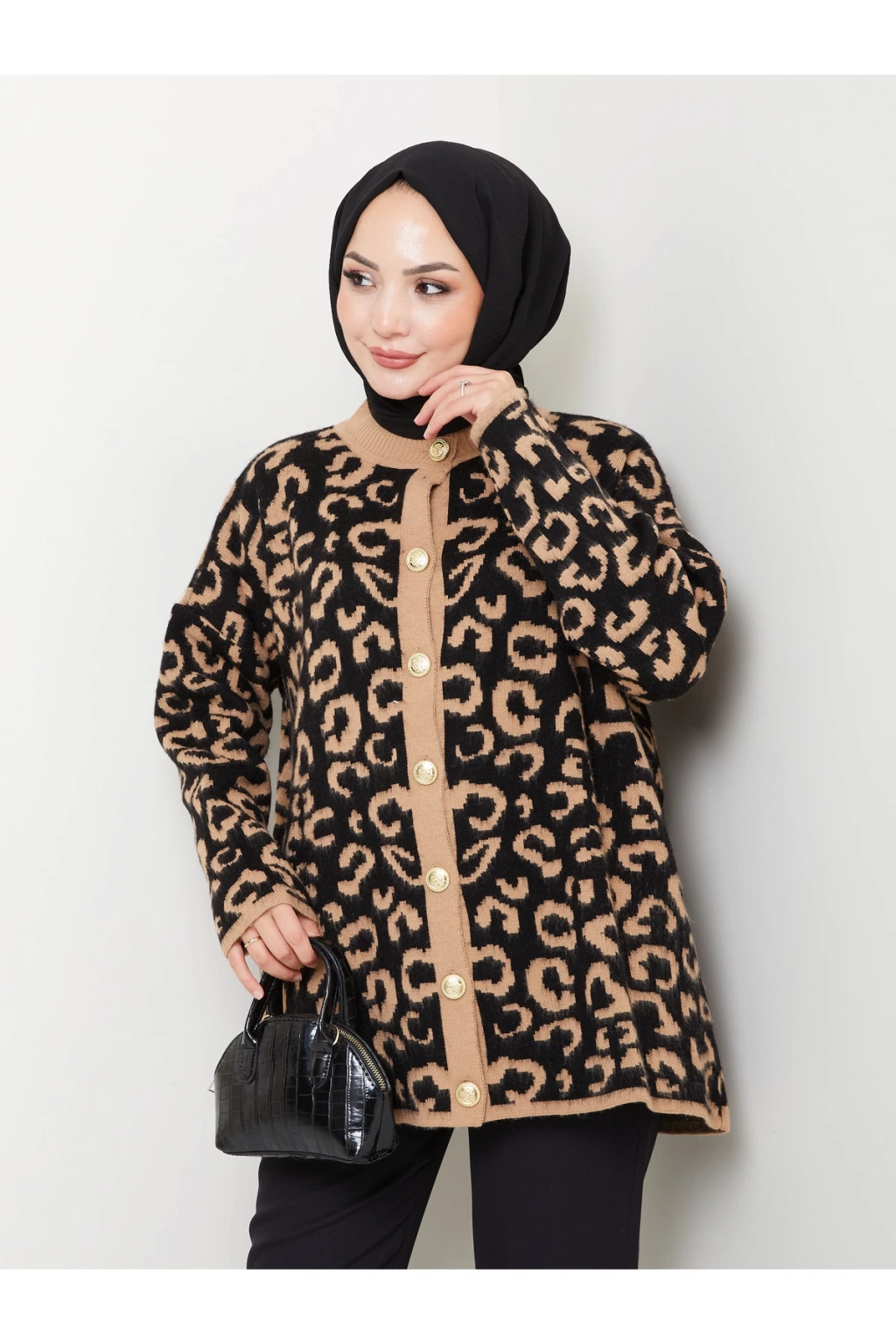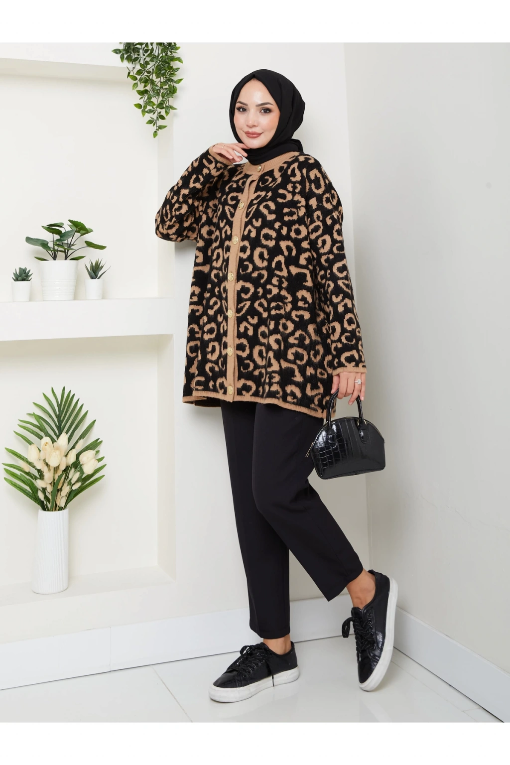 KADIN LEOPAR DESEN UZUN HIRKA YUMOŞ TRİKO GOLD DÜĞMELİ KAHVE