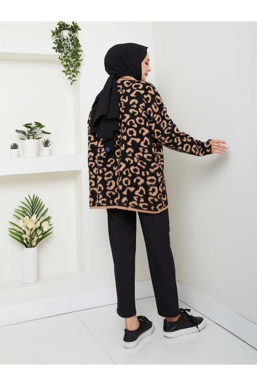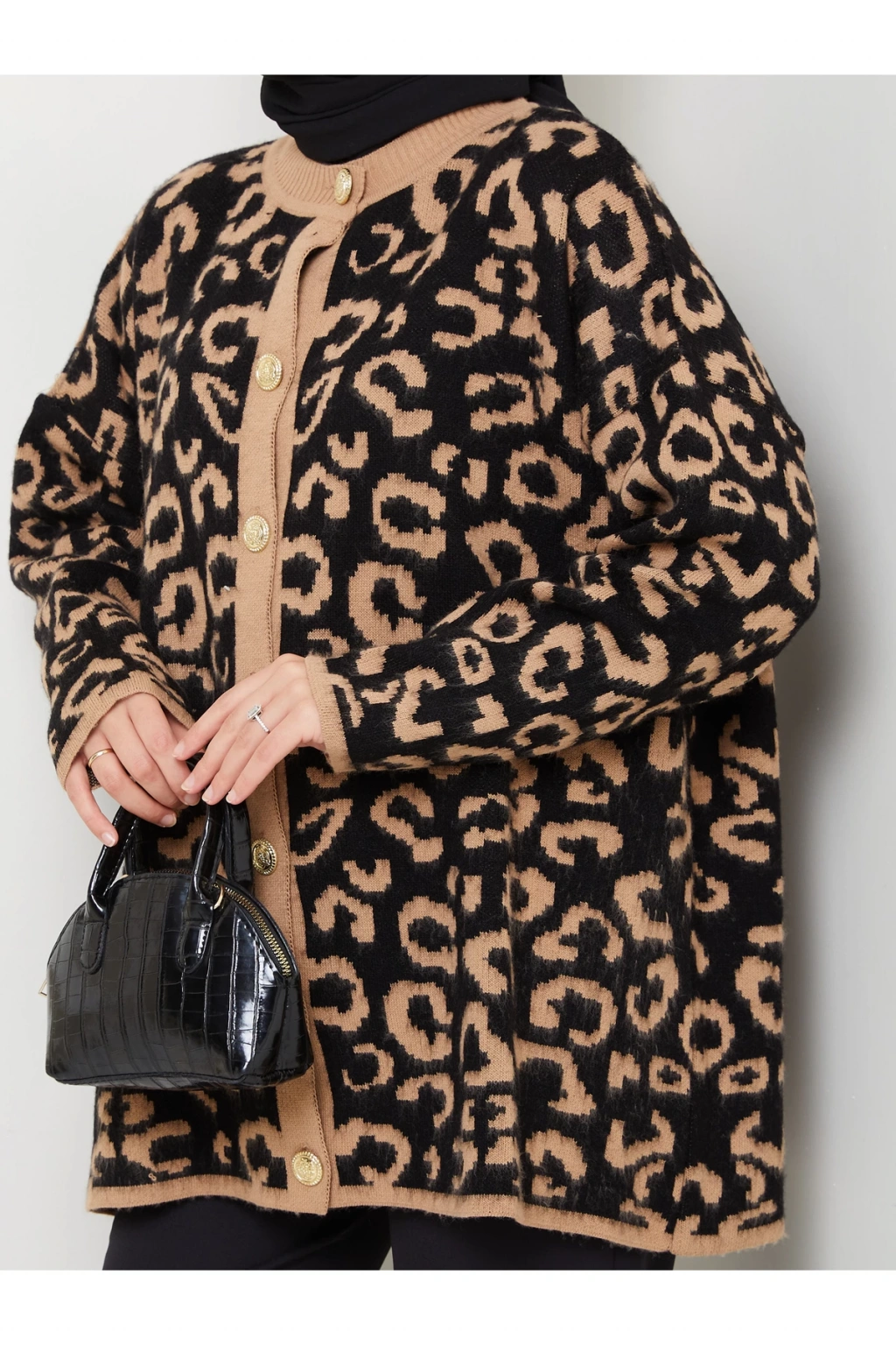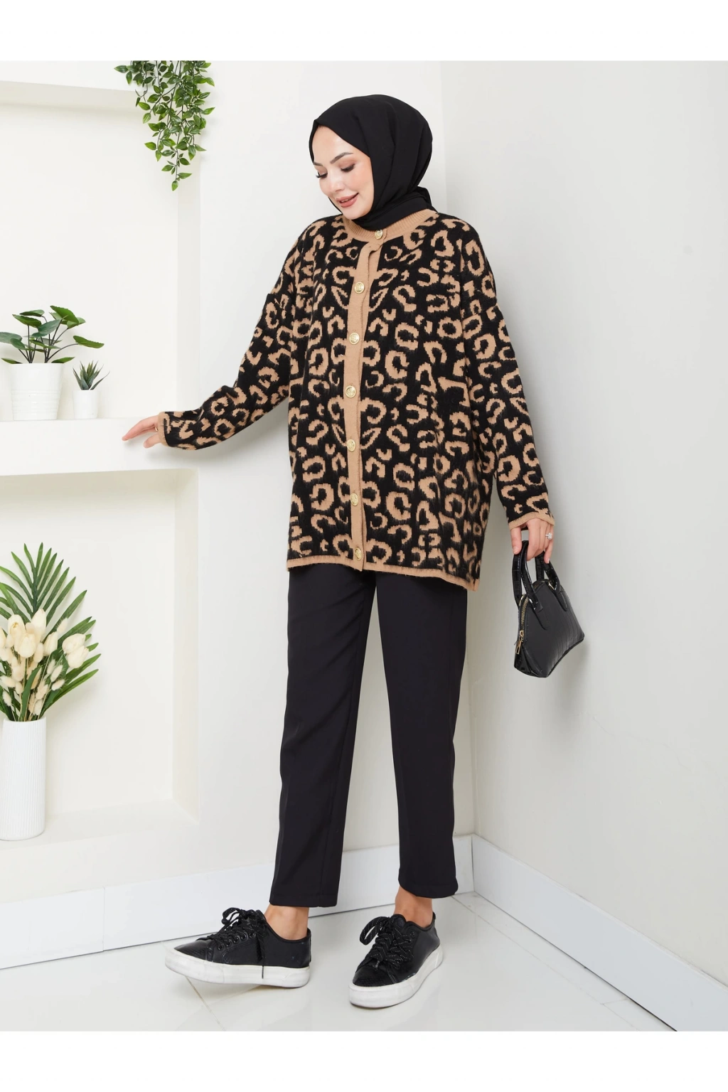 KADIN LEOPAR DESEN UZUN HIRKA YUMOŞ TRİKO GOLD DÜĞMELİ KAHVE