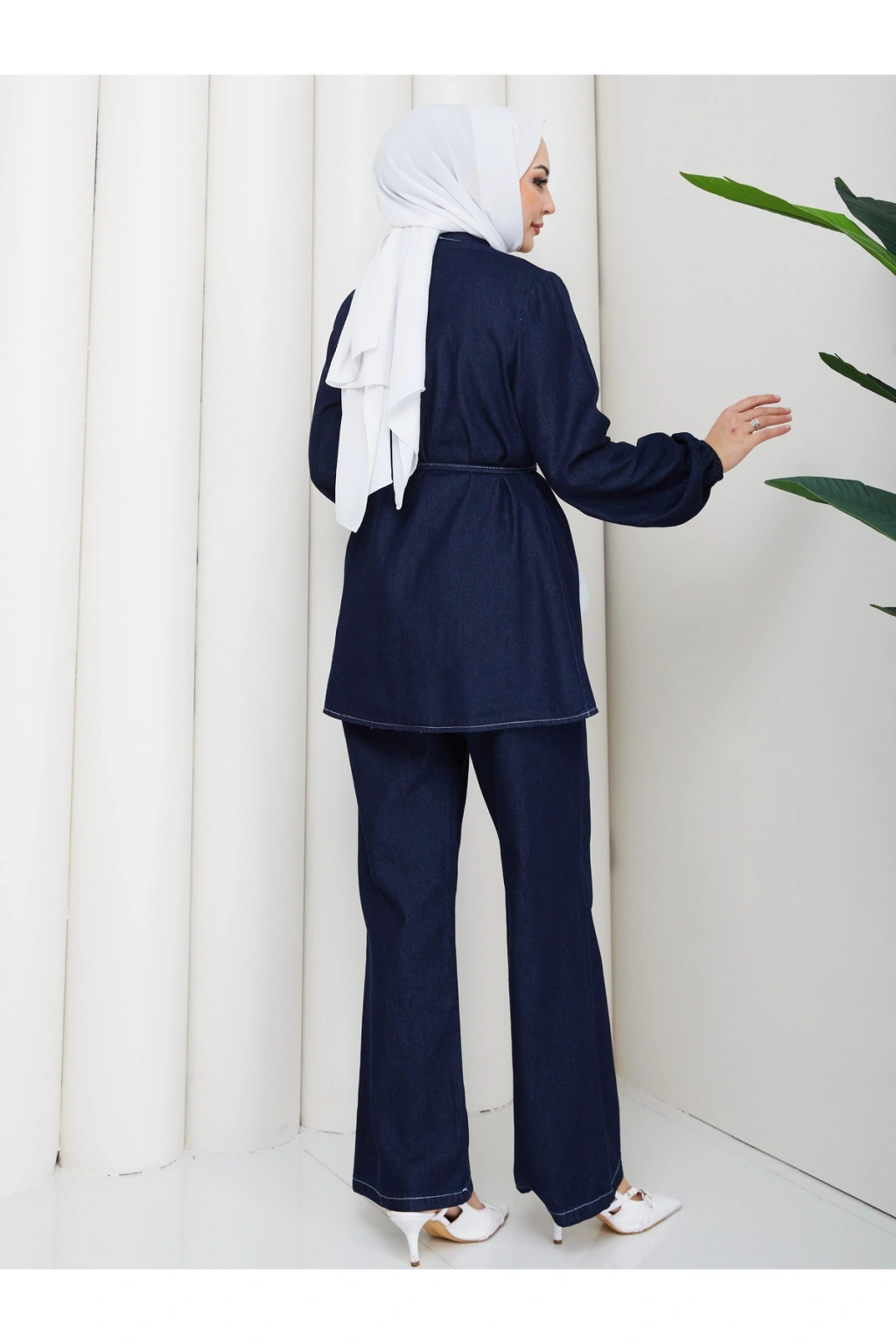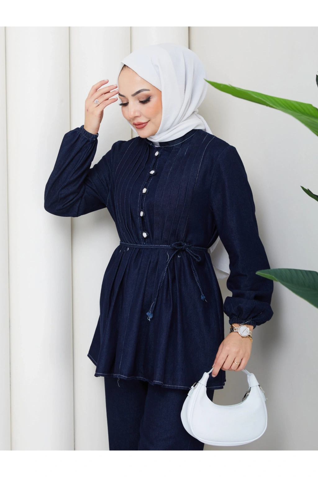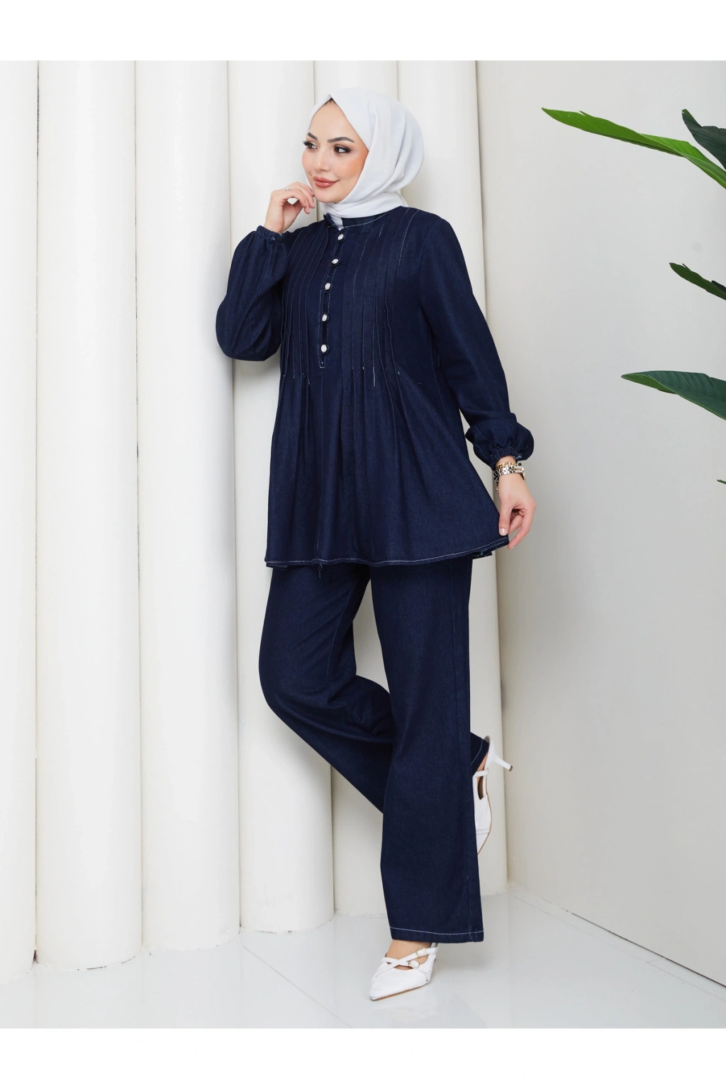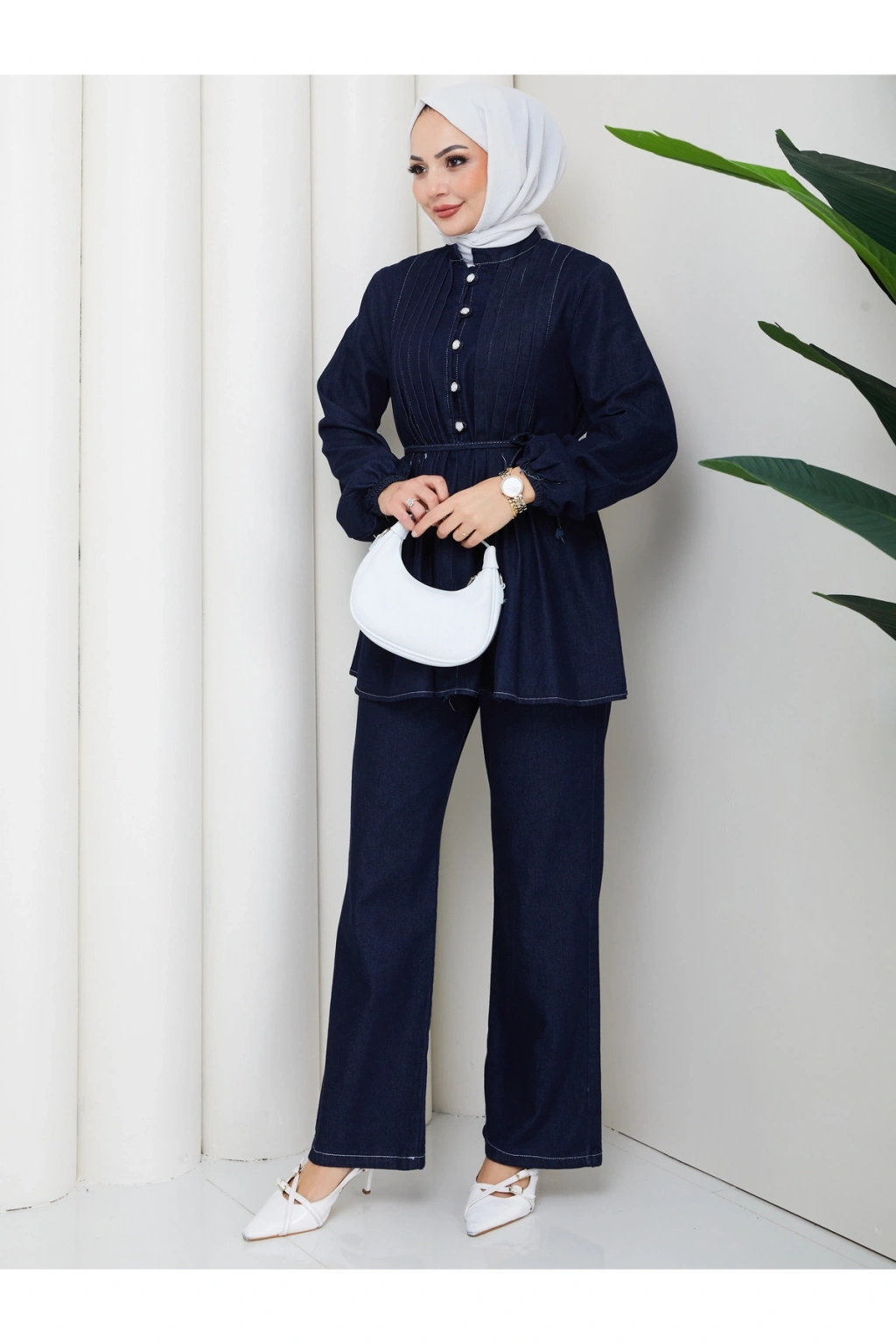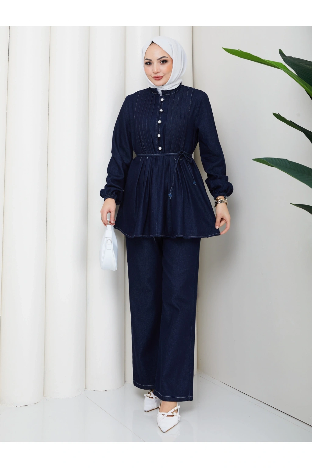KADIN NERVÜLLÜ BİYELİ DÜĞMELİ BAĞCIKLI KOT TAKIM