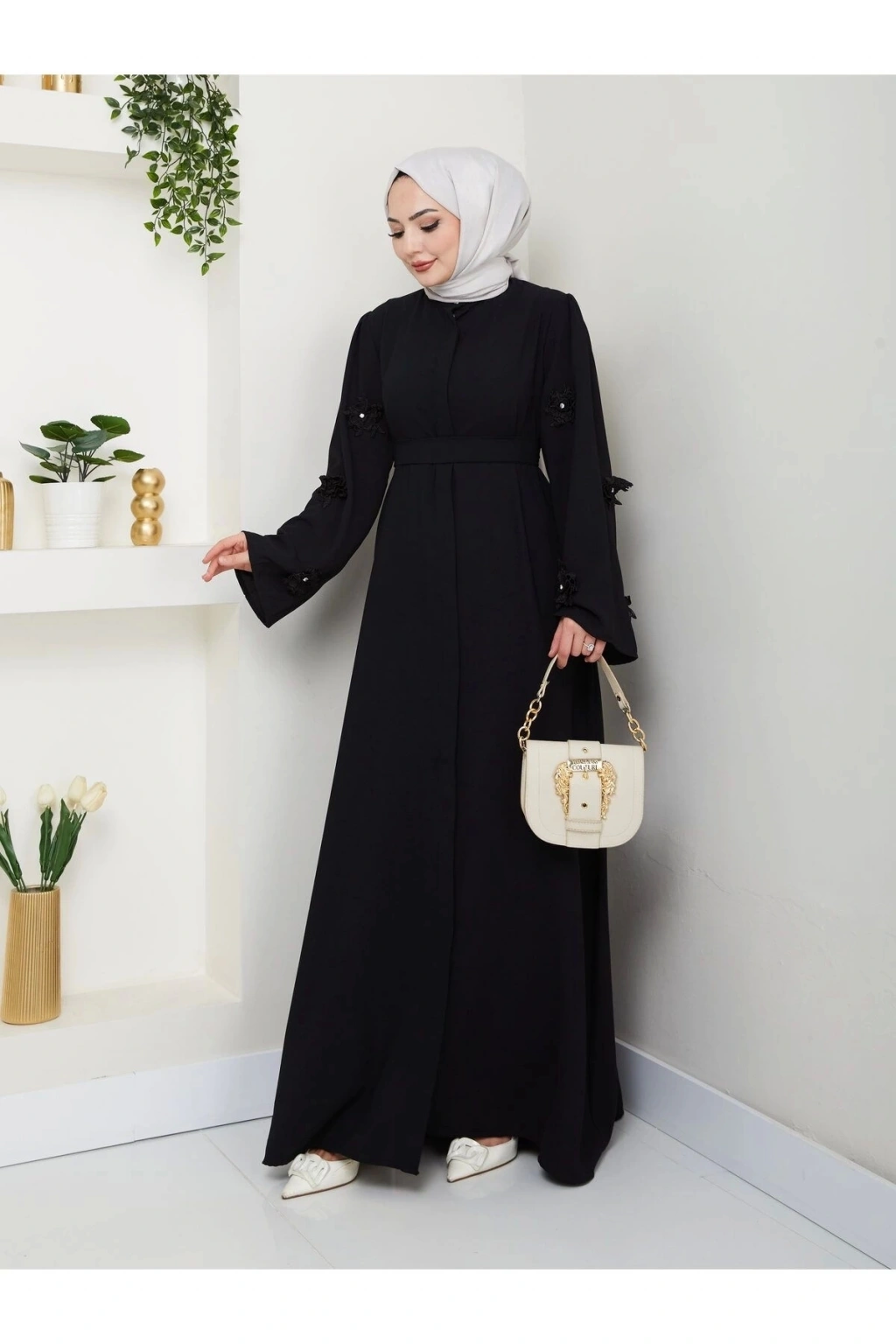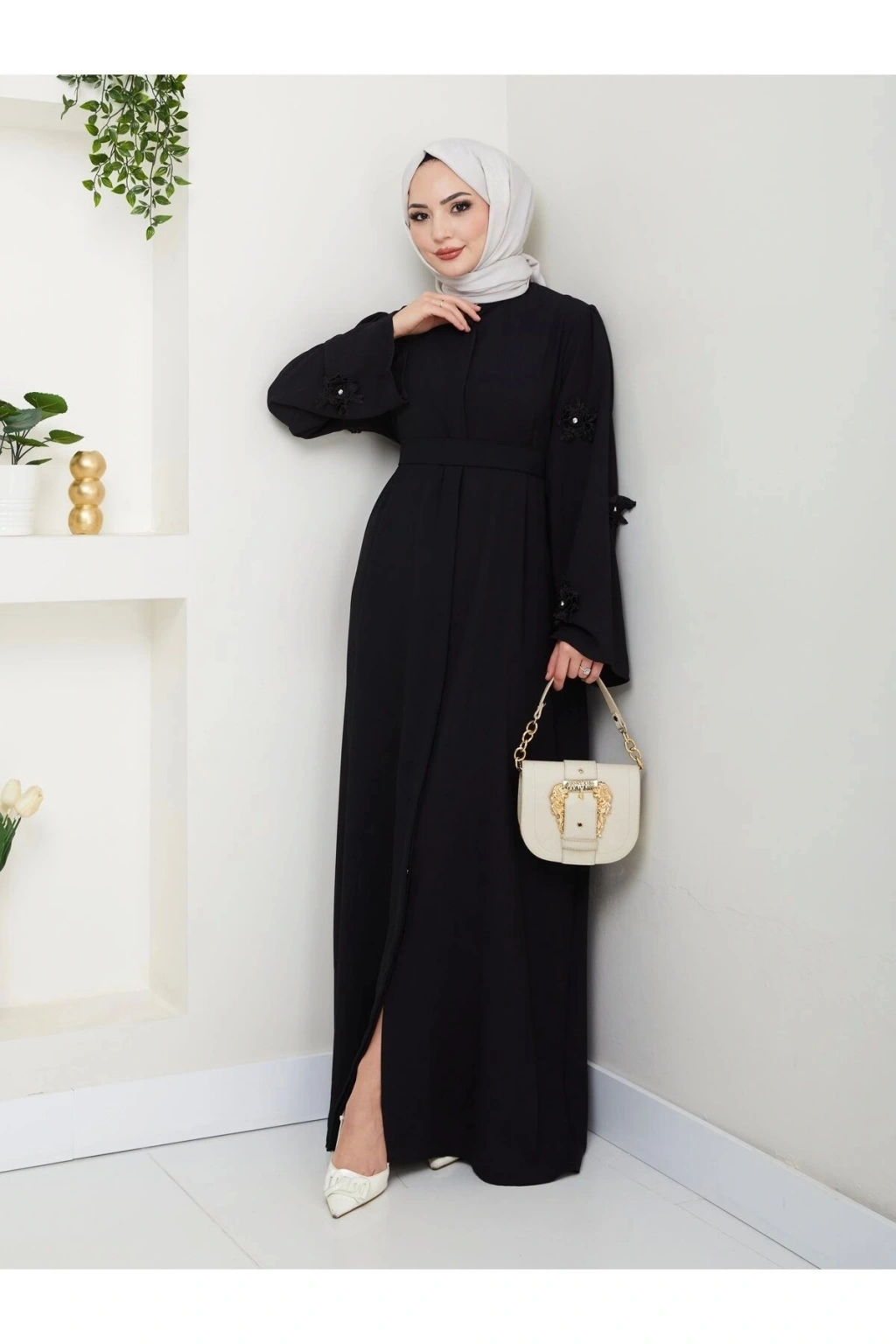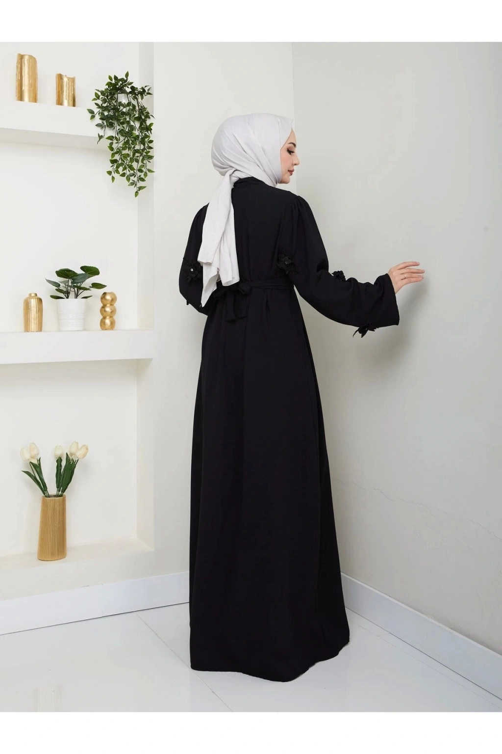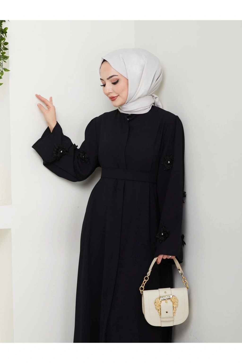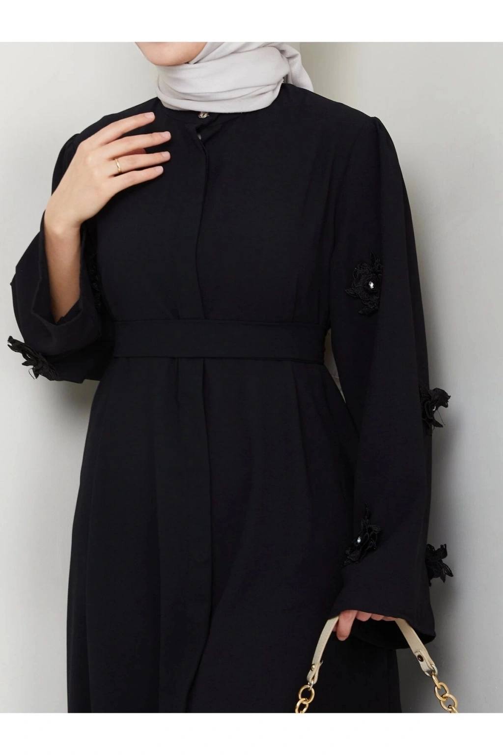 KOLU GÜL DANTELLİ DETAYLI ABAYA TESETTÜR GIYIM KADIN FERACE ELBISE SİYAH