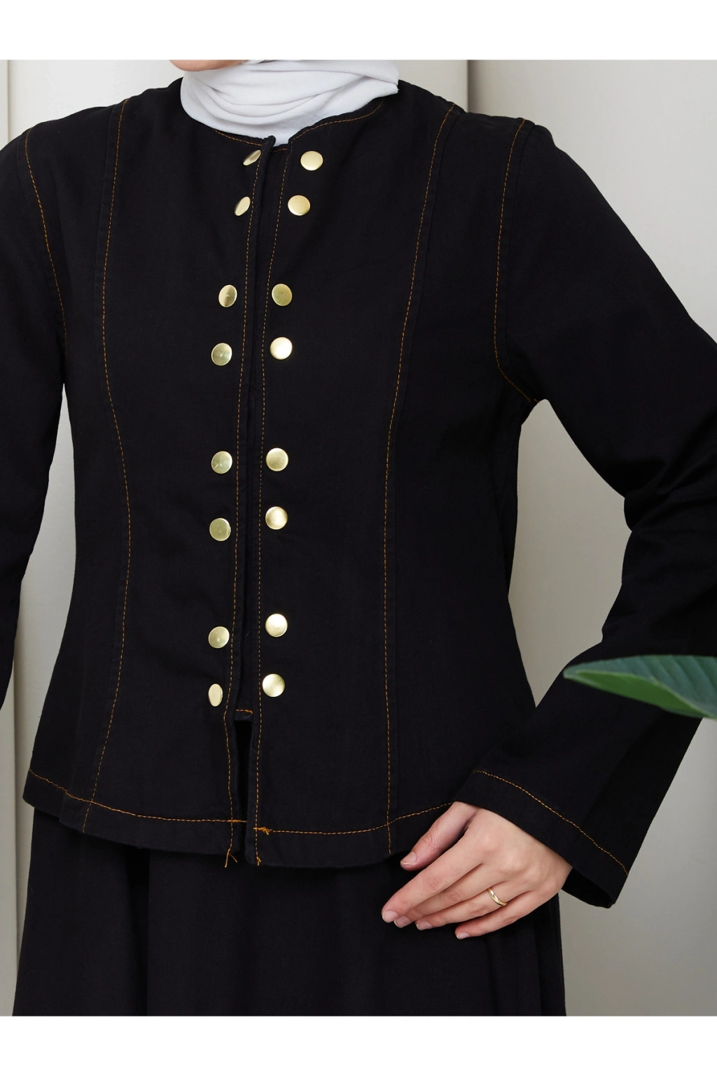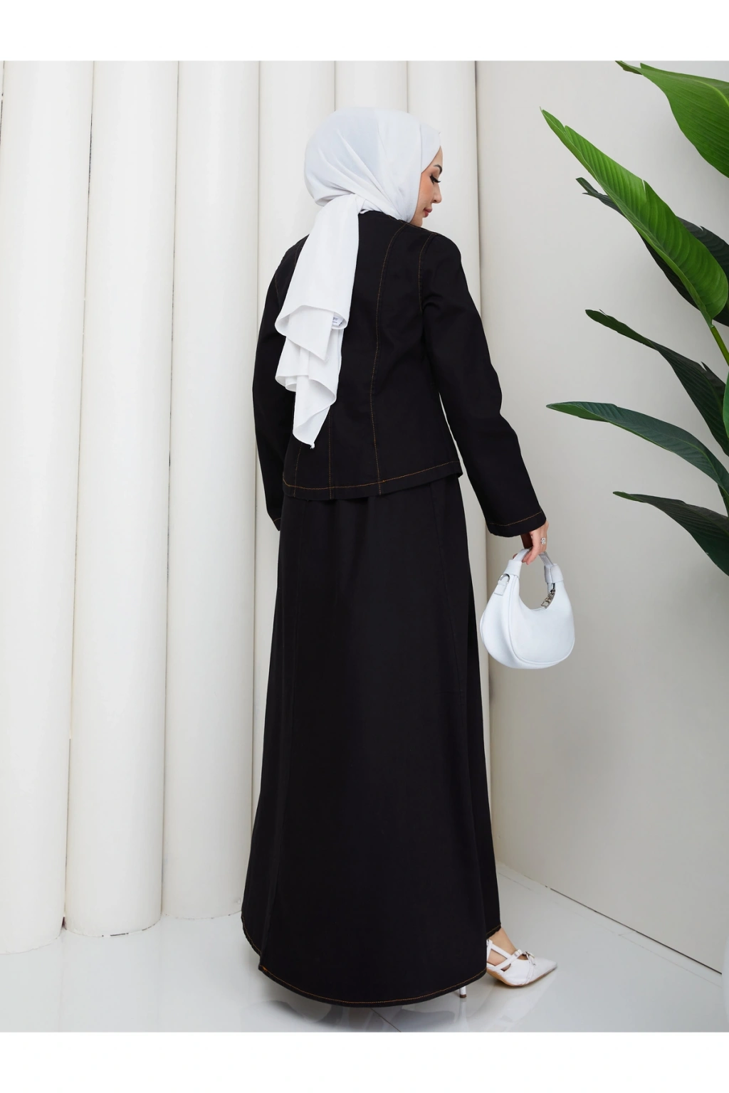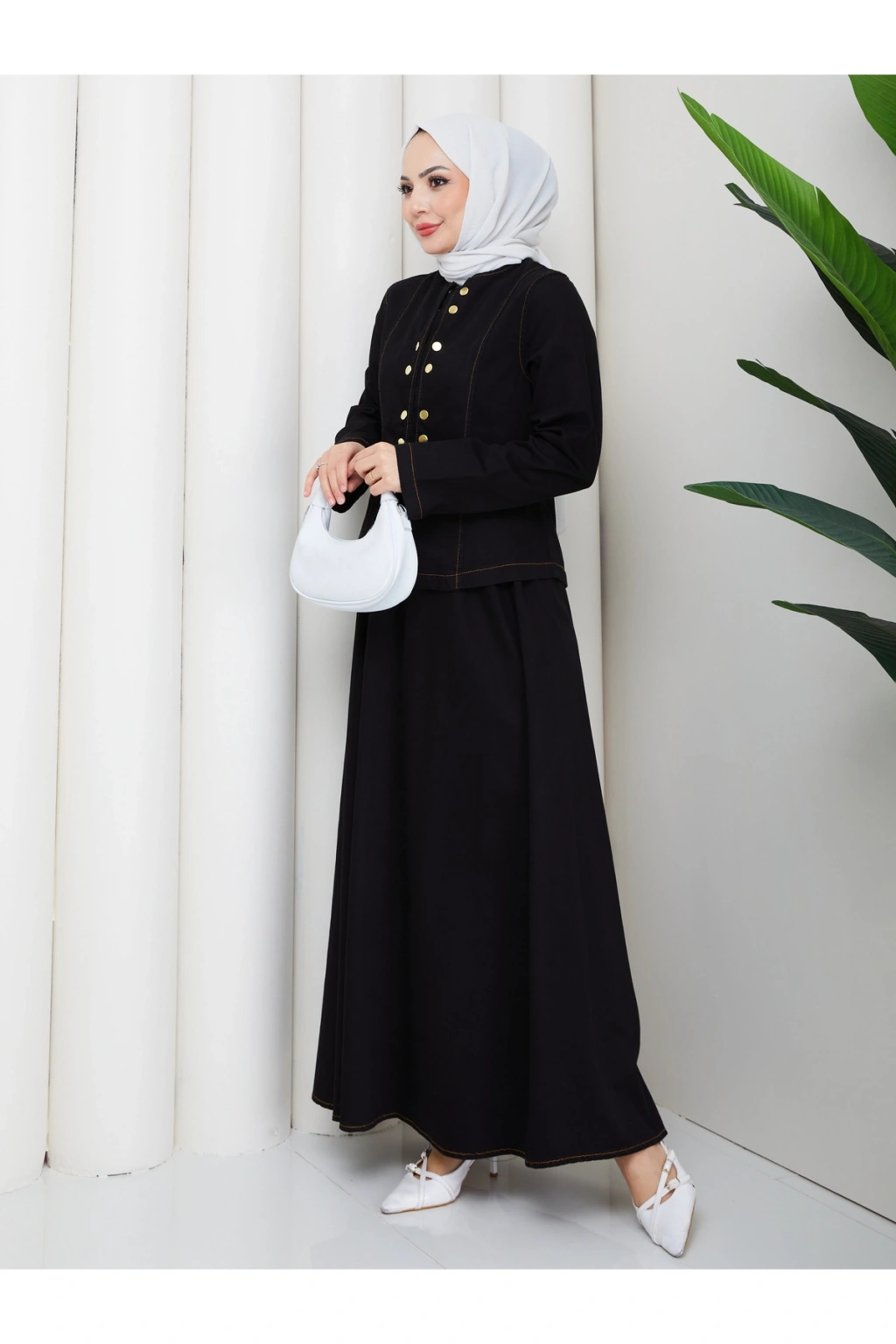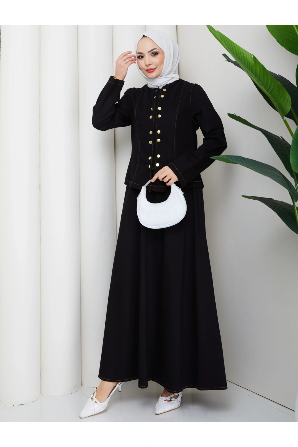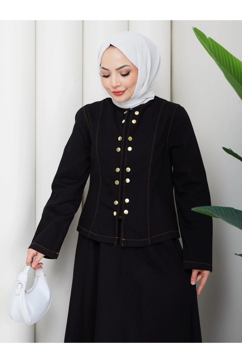 - Tesettür giyim koleksiyonuna özel tasarlanmış, rahat ve şık bir görünüm sunan kot takım.; - Tunik ve etek olmak üzere iki parçadan oluşan set, günlük kullanım için idealdir.; - Orta kalınlıkta denim kumaşı ile mevsim geçişlerinde ve serin havalarda konfor sağlar.; - Uzun kollu tasarımı ile tesettür giyim tarzınıza uyum sağlar.; - Düz dokuma kumaşı, sade ve şık bir görünüm kazandırırken çift cepli yapısı pratik kullanım sunar.; - Çıtçıtlı kapama şekli sayesinde kolayca giyilip çıkarılabilir ve bel kısmı lastikli olduğu için rahat bir oturuş sağlar.; - Astarsız yapısı hafifliğiyle öne çıkarken, sıfır yaka tasarımı modern bir dokunuş katmaktadır.; - Regular silueti ile vücut hatlarınıza uyum sağlayan fitted kalıp, şık ve zarif bir görünüm sunar.; - Yıkamalı özelliği sayesinde kullanımlık ve dayanıklılık açısından avantajlıdır.; - Türkiye'de üretilmiş olup, yerel üretim kalitesini yansıtır.;