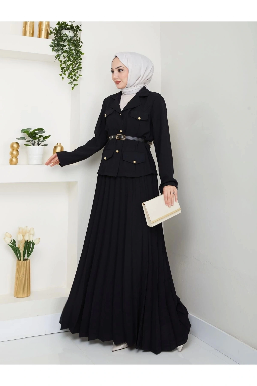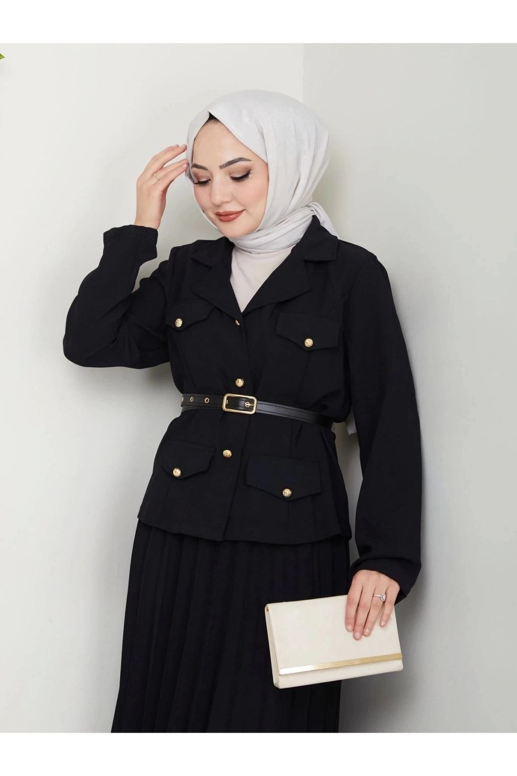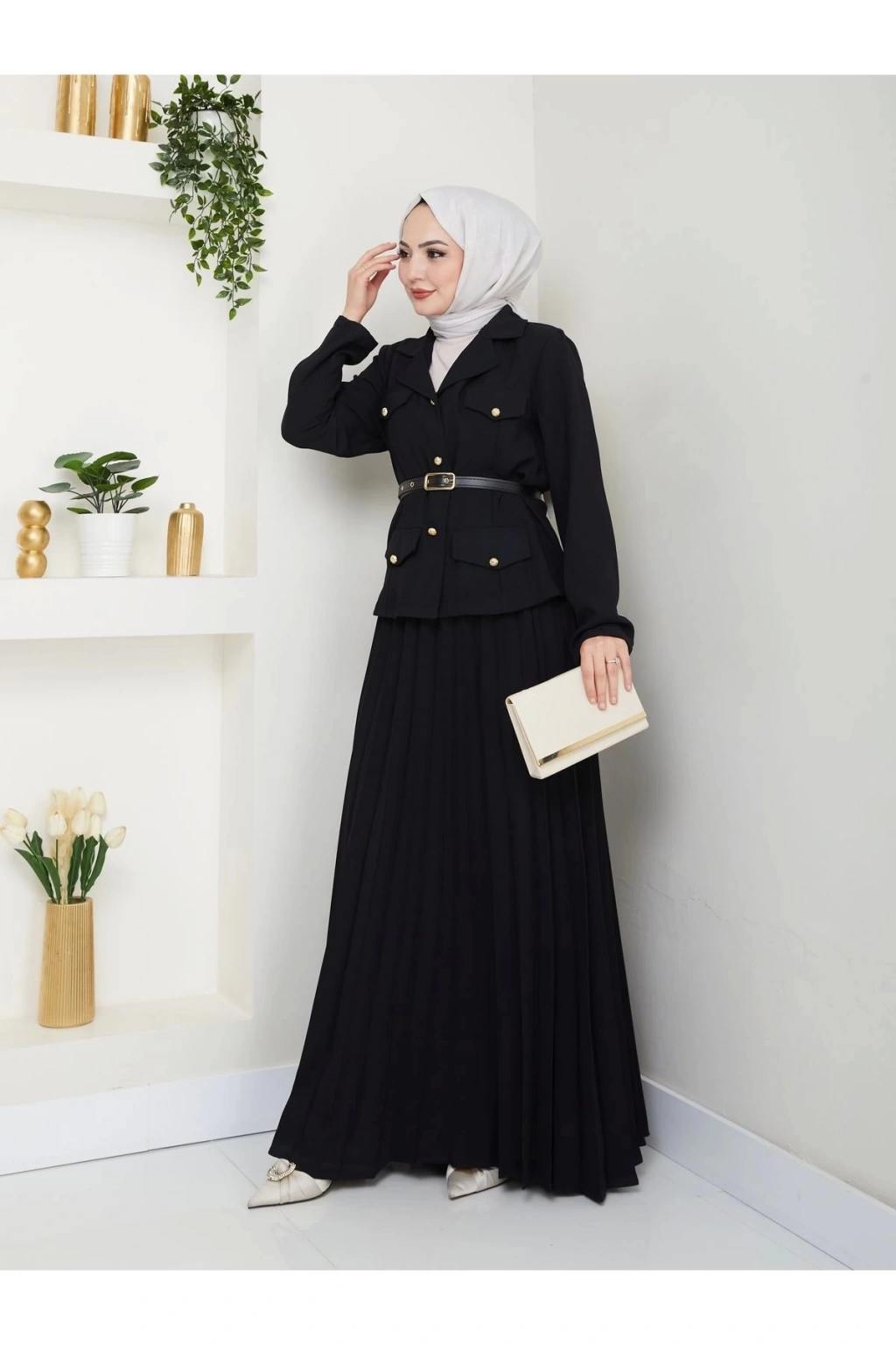 PİLELİ ETEKLI CEKETLI GOLD DÜĞMELİ KEMERLİ BLAZER TESETTÜR TAKIM SİYAH 806