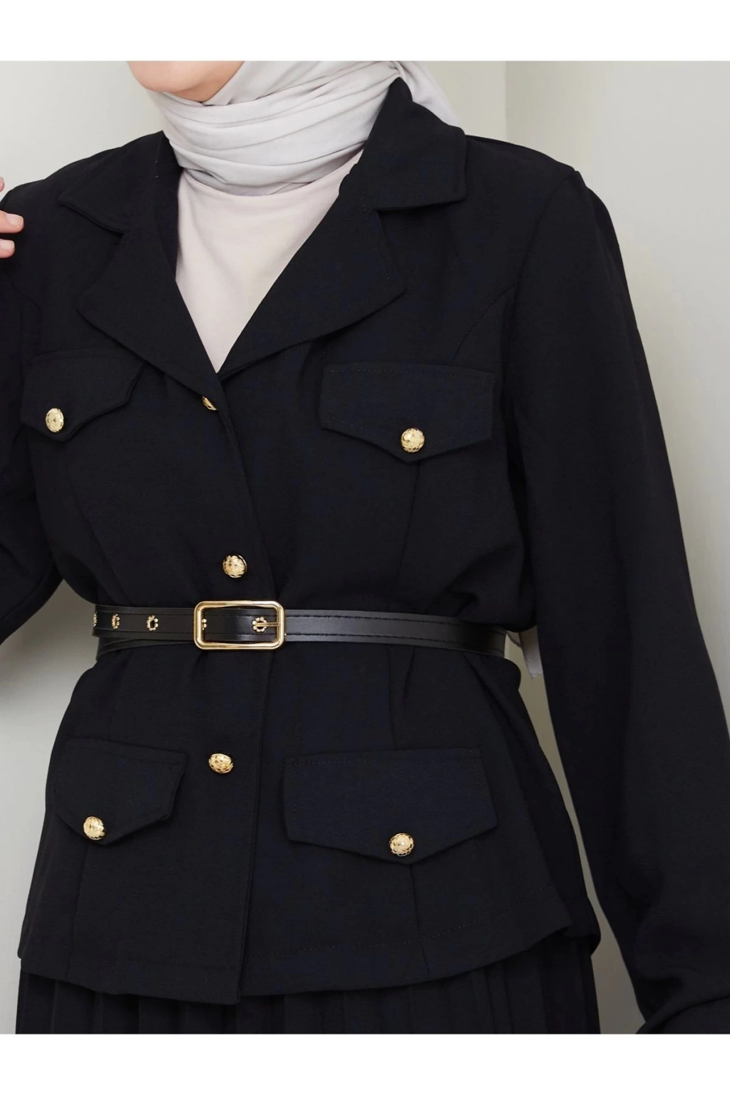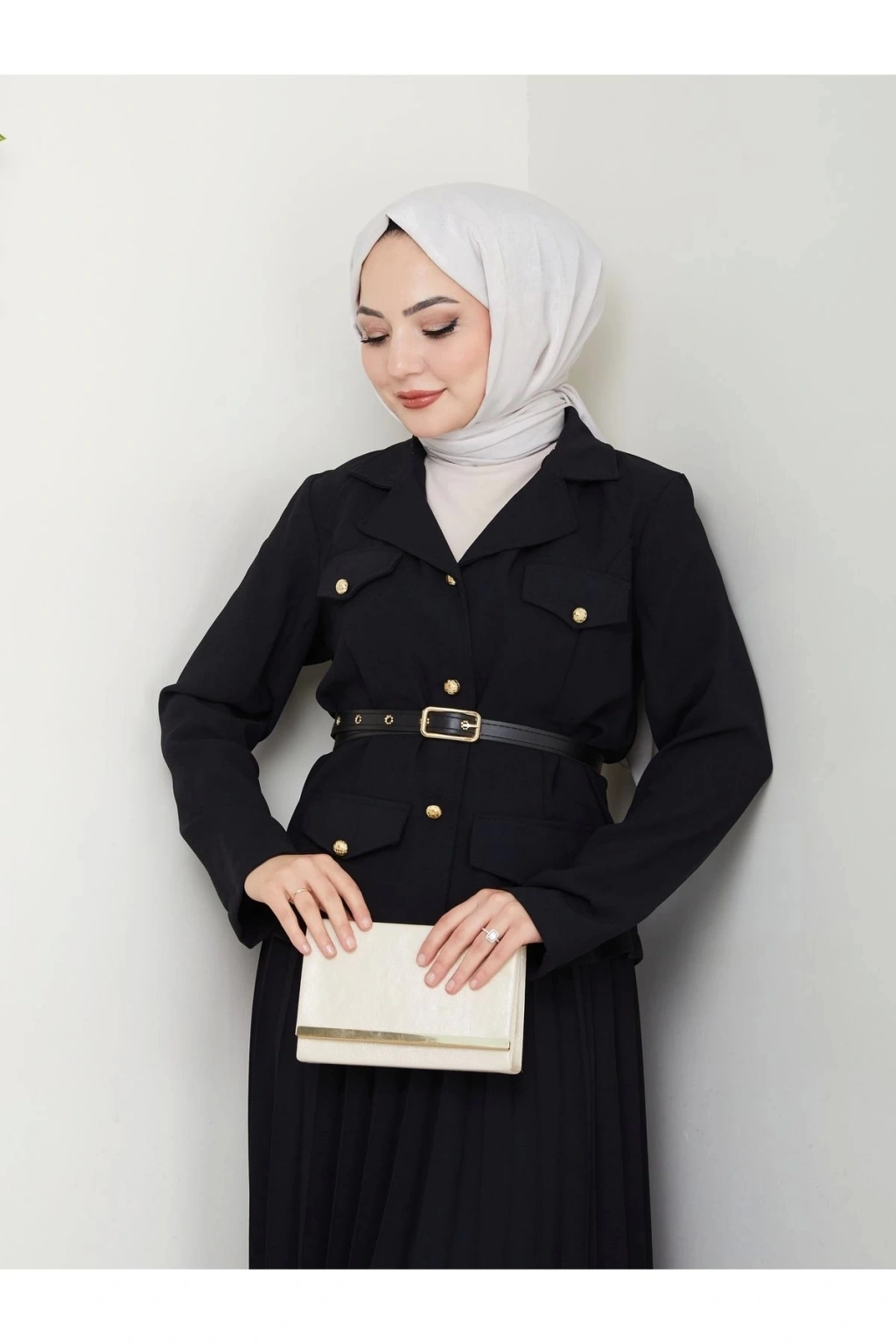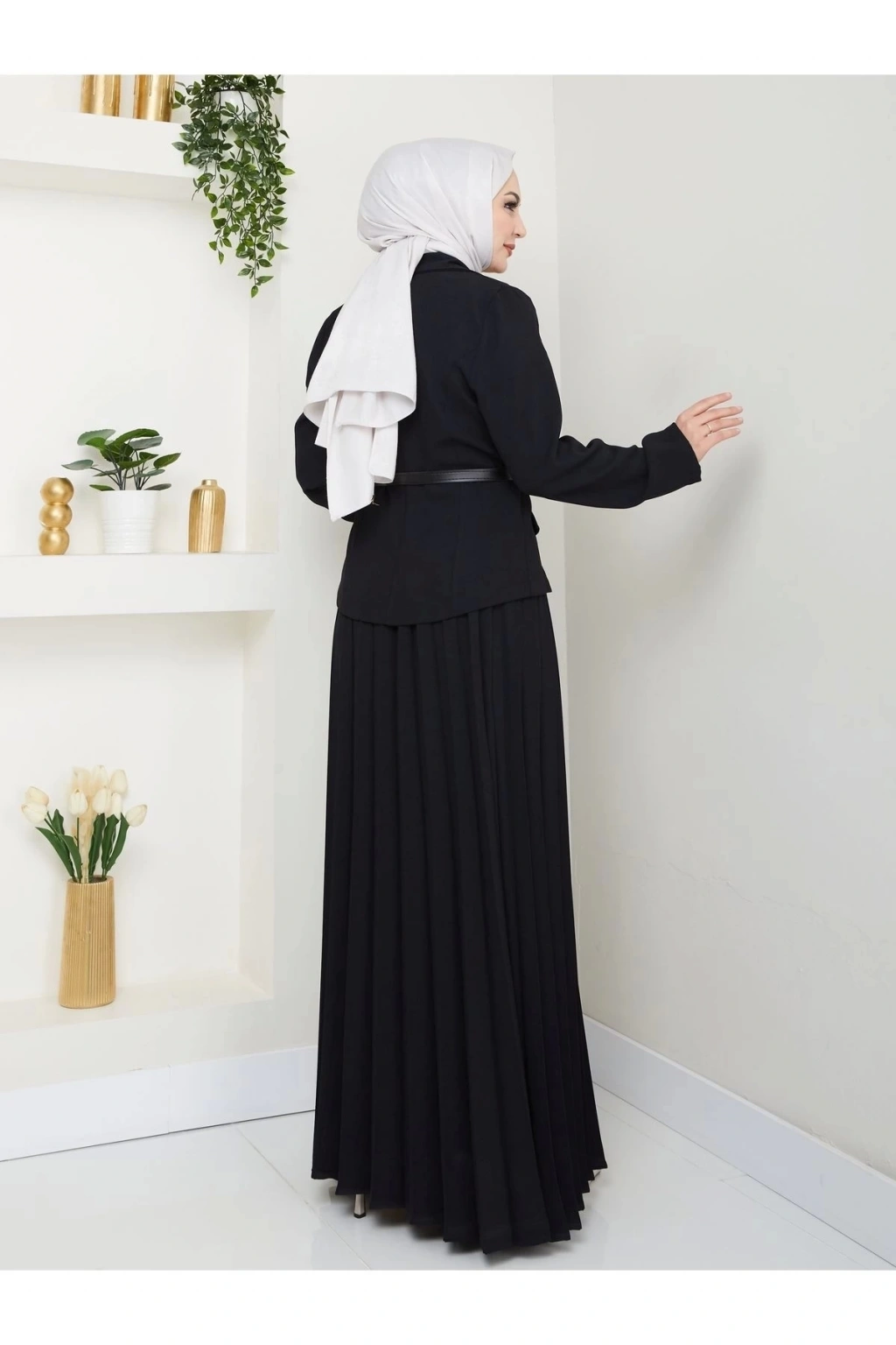 PİLELİ ETEKLI CEKETLI GOLD DÜĞMELİ KEMERLİ BLAZER TESETTÜR TAKIM SİYAH 806