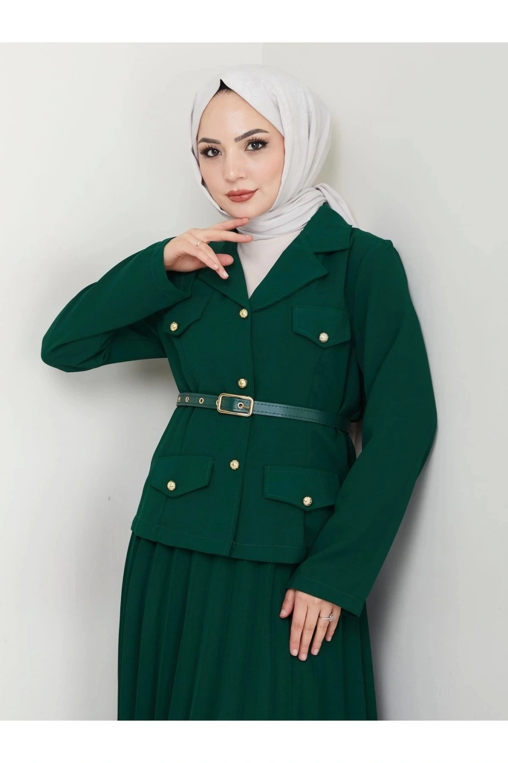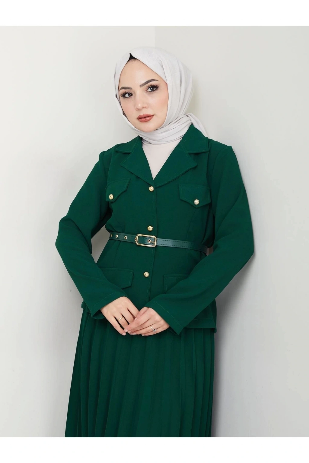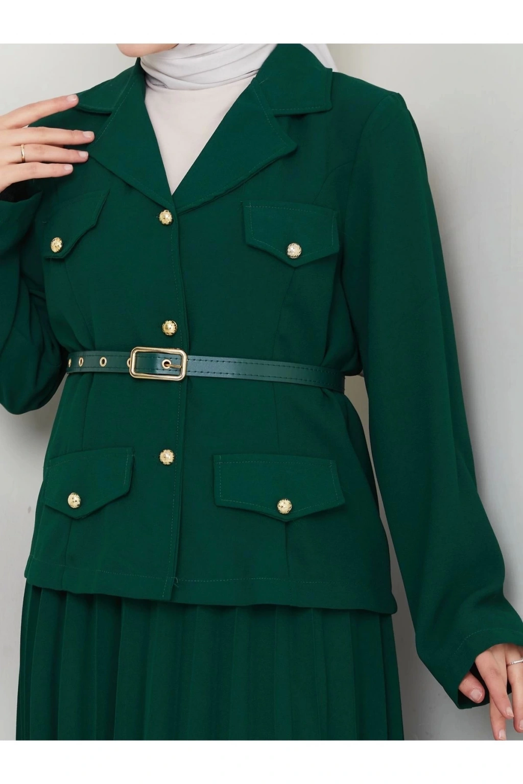 PİLELİ ETEKLI CEKETLI GOLD DÜĞMELİ KEMERLİ BLAZER TESETTÜR TAKIM ZÜMRÜT 806