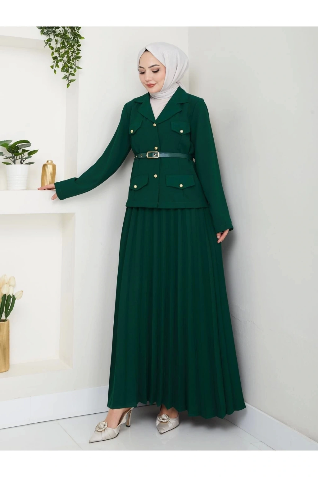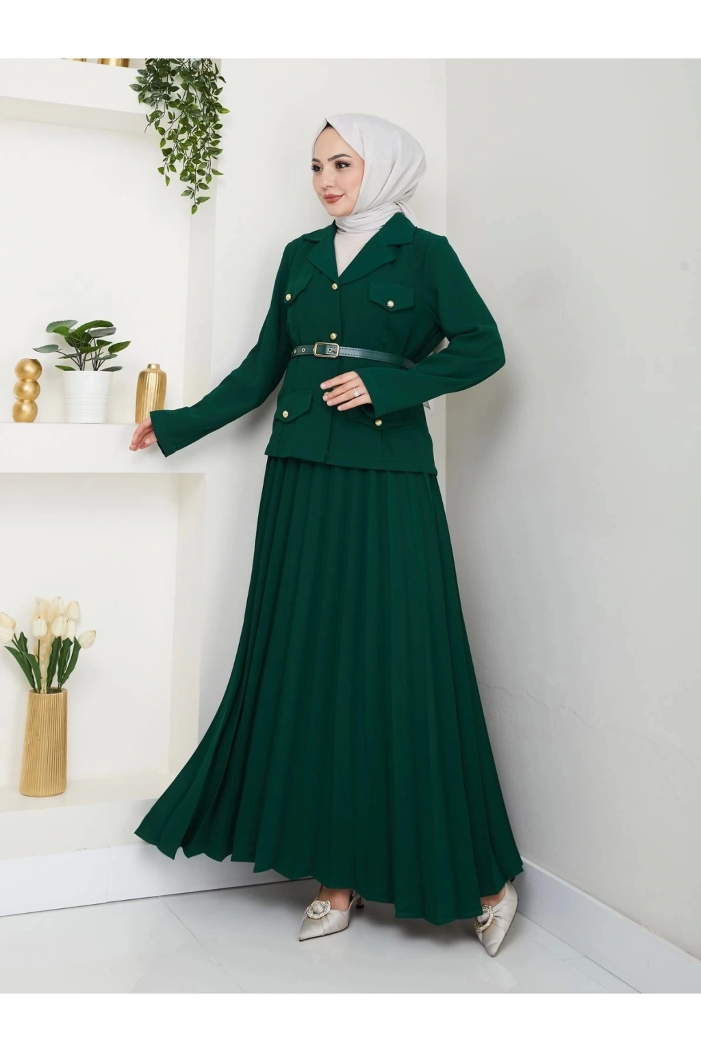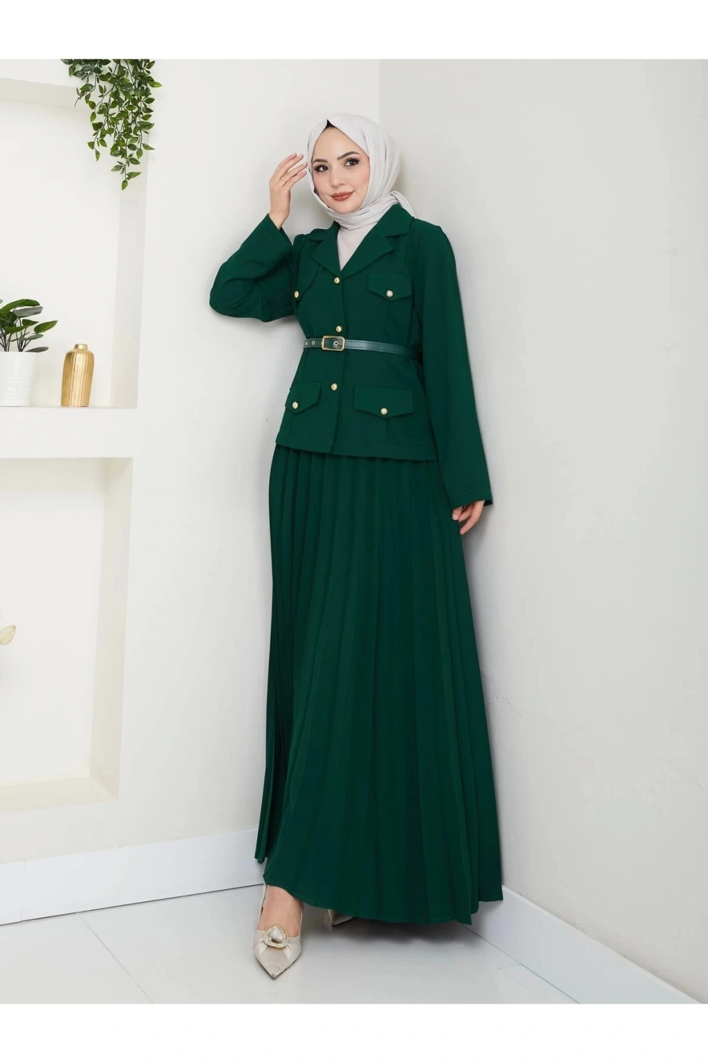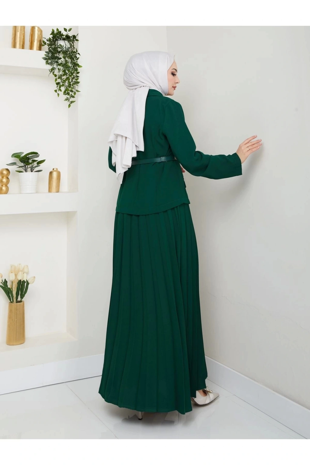 PİLELİ ETEKLI CEKETLI GOLD DÜĞMELİ KEMERLİ BLAZER TESETTÜR TAKIM ZÜMRÜT 806