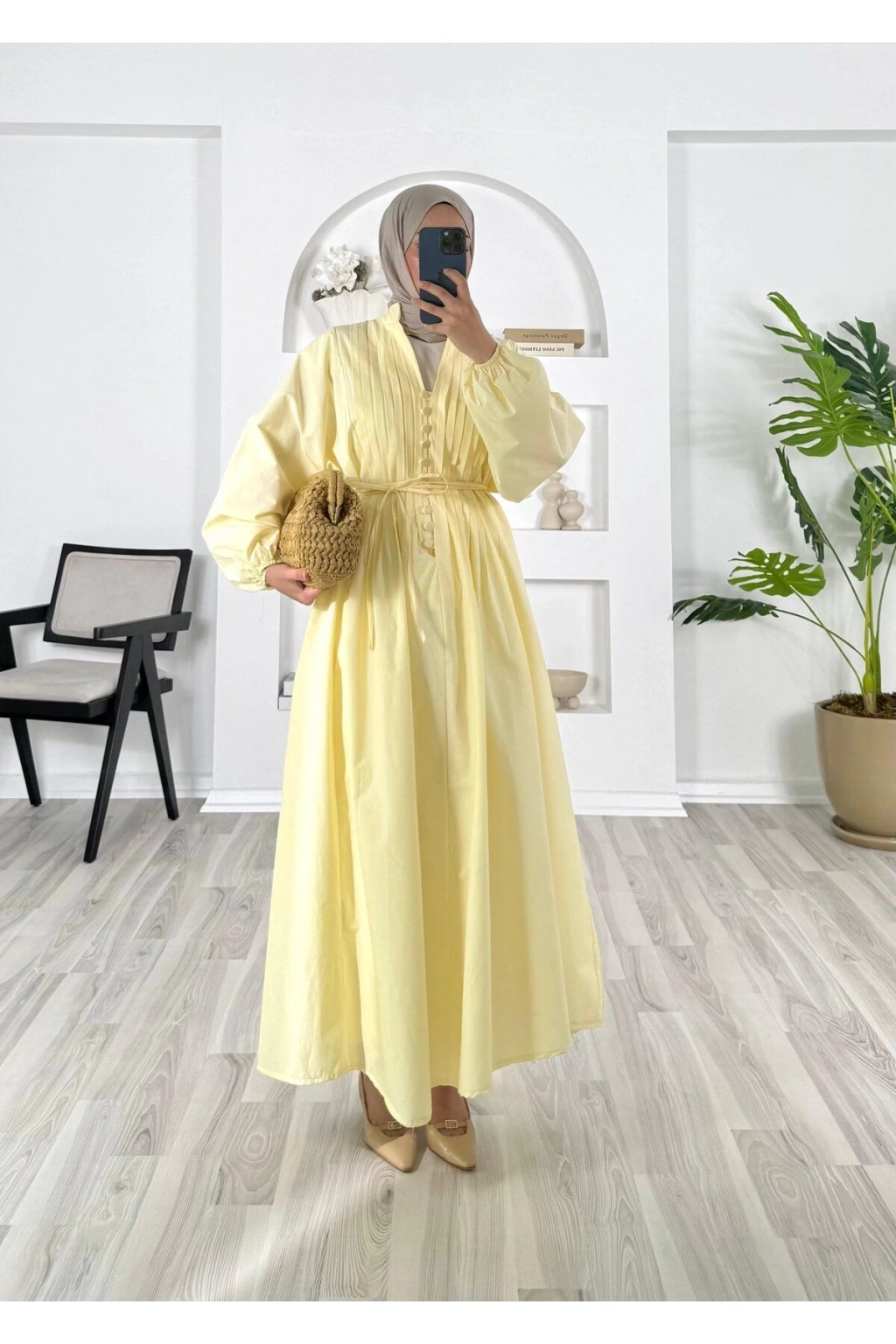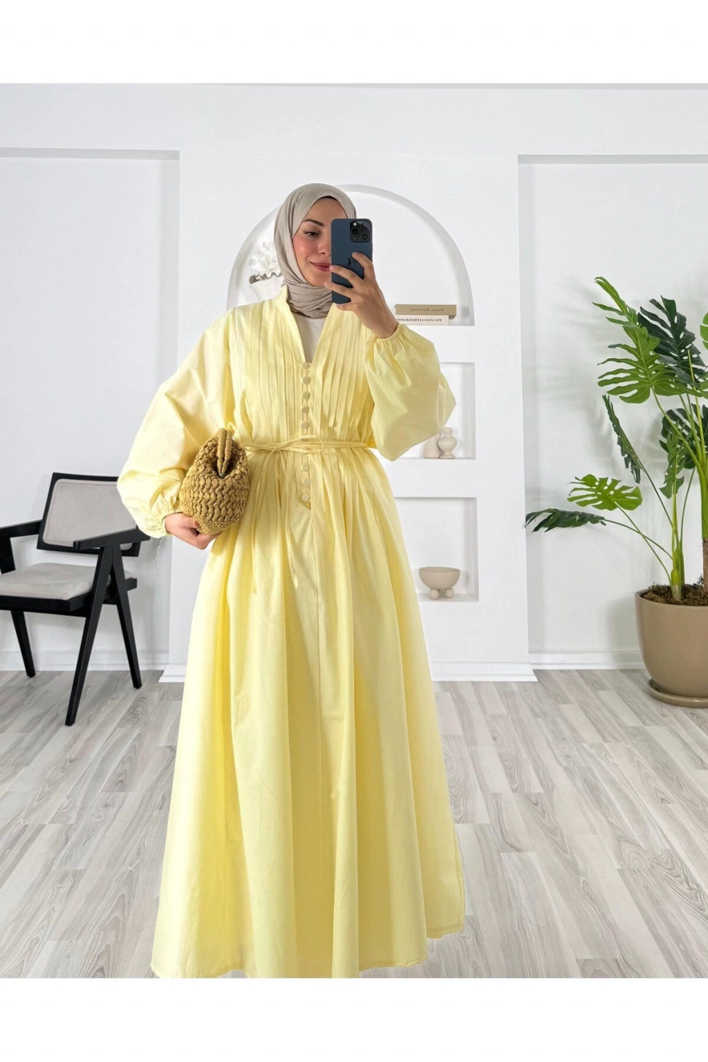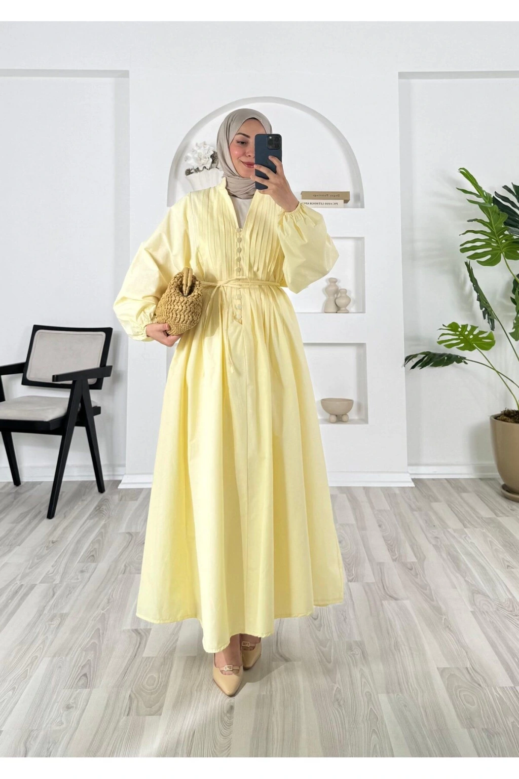 POPLİN KUMAŞ ÖNÜ NERVÜLLÜ BİYELİ ELBİSE SARI