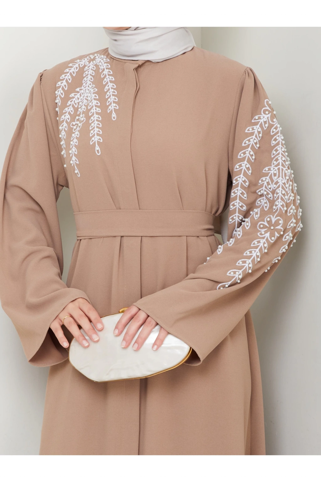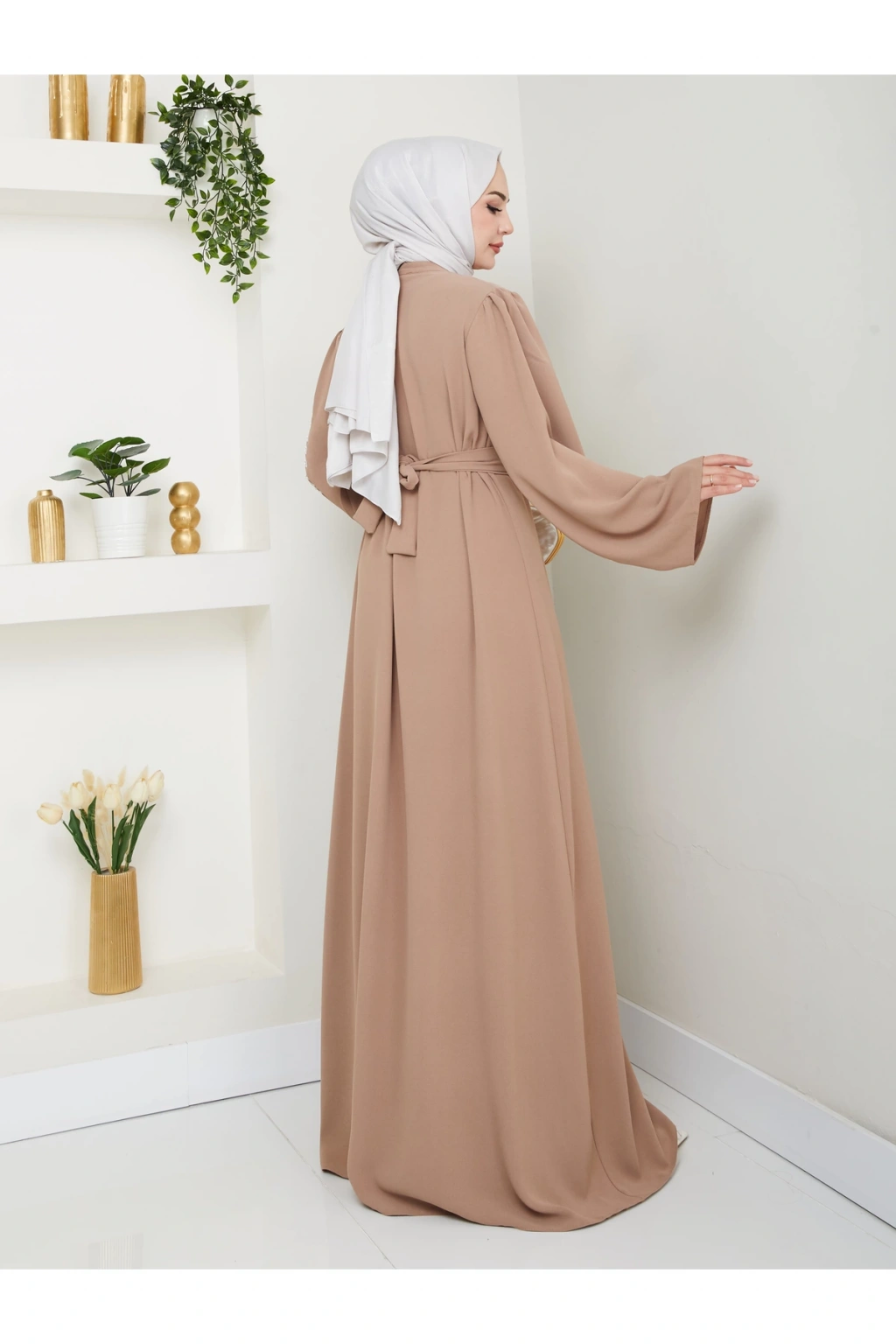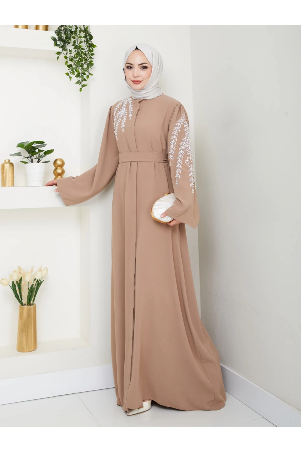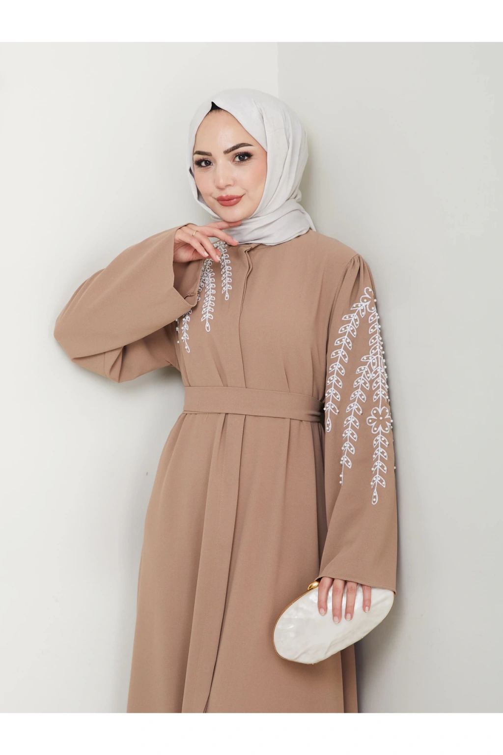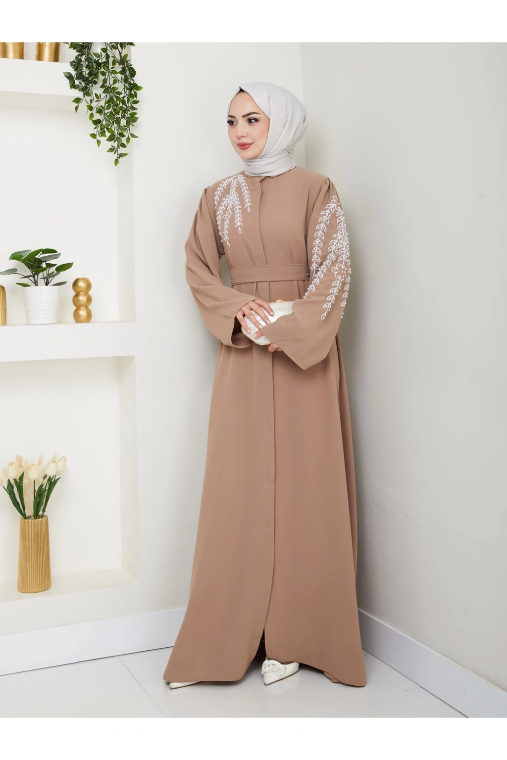 TAŞLİ ABAYA TESETTÜR GIYIM KADIN FERACE ELBISE BEJ